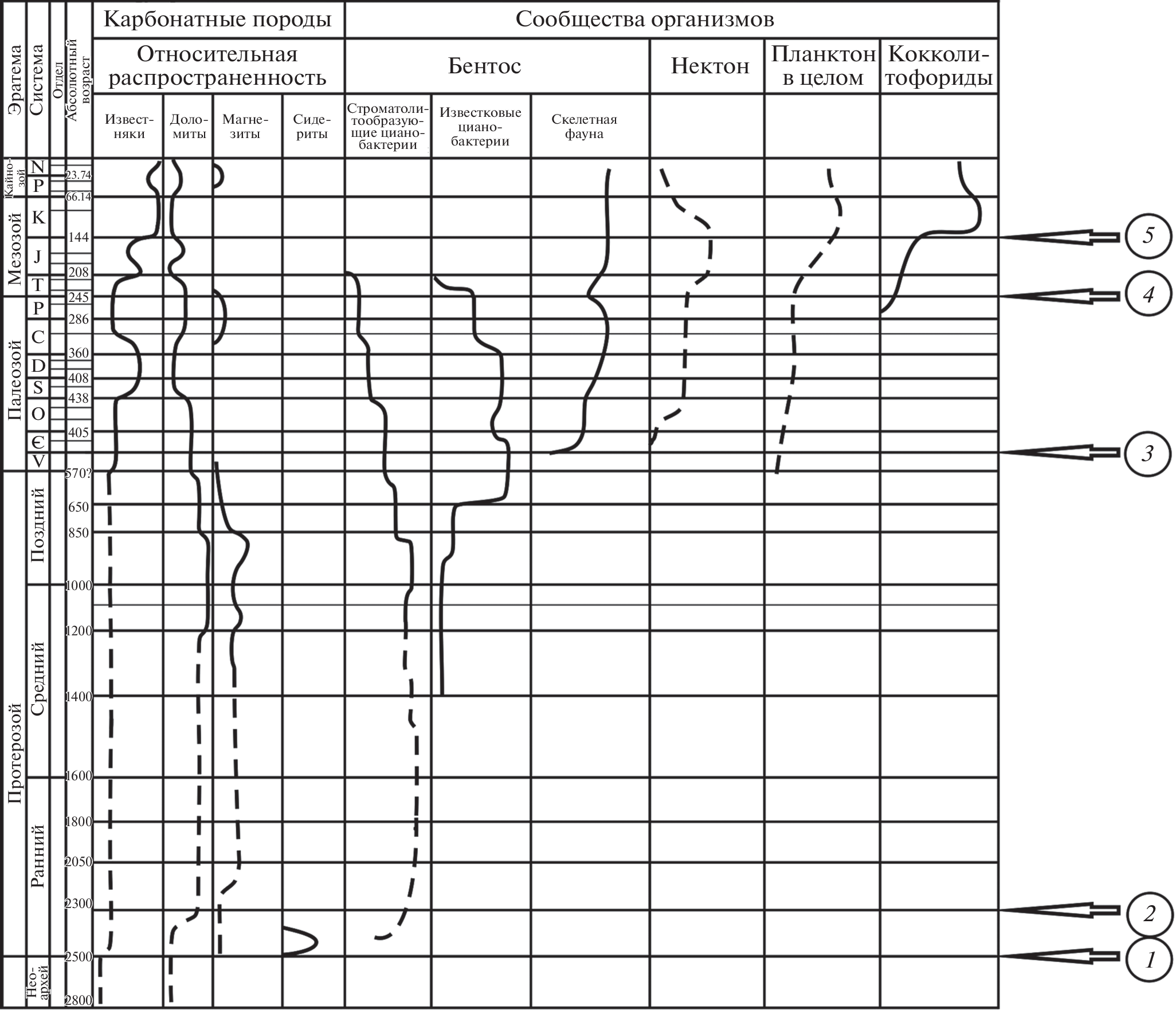 In the geological history of the Earth, there has been a significant change in the composition and areas of formation of carbonate deposits, which reflects the general evolution of methods, paleogeographic and geochemical settings during this time, and different stages in this evolution. At the Archean-Proterozoic boundary, acidic conditions in impounded bodies changed to moderately acidic, which is seen in the appearance of iron carbonates. The second frontier is the Siderian-Rhyacian boundary, when intensive assimilation of CO2 led to the formation of alkaline conditions in impounded bodies and the accumulation of magnesian carbonates. Carbonate accumulation itself occurred in the impounded bodies of continental block. The third milestone is the Vendian-Cambrian boundary, when skeletal fauna appeared, and carbonate accumulation became largely biogenic. Along with the basins of the continental block, there were new oceanic areas of formation of carbonate sediments, where the skeletons of nekton organisms became a significant supplier of material. The fourth boundary – Paleozoic-Mesozoic one – was the beginning of the accumulation of the proper oceanic deep-water carbonate sediments. The fifth milestone is associated with the Cretaceous period, when oceanic carbonate accumulation sharply increased due to planktonic organisms.