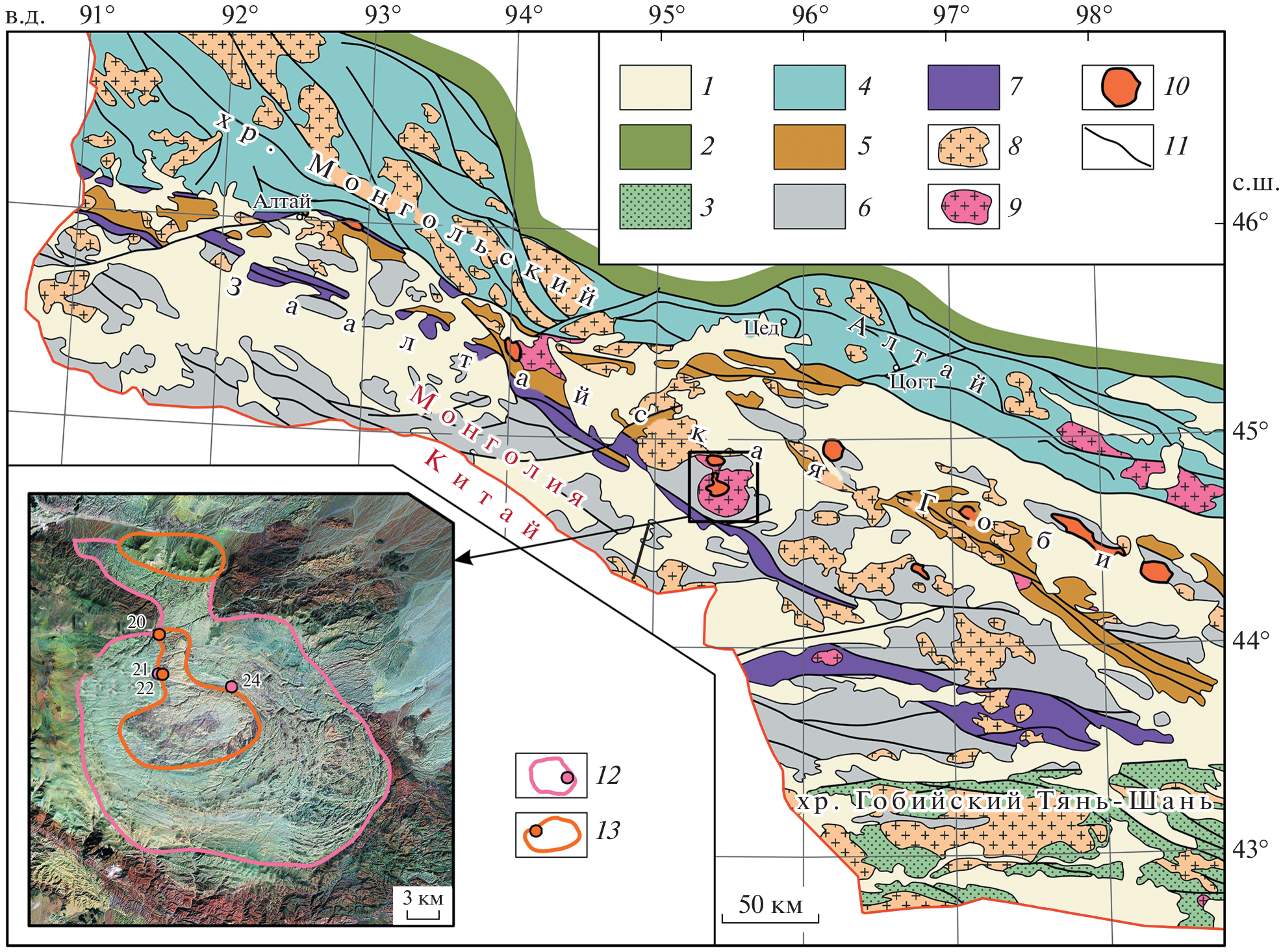 В строении массива Адж-Богд, расположенного в Заалтайской Гоби в пределах герцинид Центрально-Азиатского складчатого пояса, участвуют породы двух основных фаз внедрения. Породы ранней фазы представлены двуполевошпатовыми гранитами, которые прорываются поздними щелочно-полевошпатовыми гранитами. При реконструкции термальной истории гранитоидов двух фаз внедрения в качестве минерала-индикатора температурного режима их формирования был выбран циркон. Было предложено два основных подхода к использованию этого минерала как геотермометра: температура насыщения цирконом и цирконий-гафниевый геотермометр. Оба подхода демонстрируют схожую термальную картину формирования гранитов массива. Щелочно-полевошпатовые граниты поздней фазы внедрения кристаллизовались при температурах T = 810‒850°C, в то время как двуполевошпатовые граниты ранней фазы – в температурном интервале T = 700–770°C. По результатам термобарогеохимических исследований расплавных включений в цирконе щелочно-полевошпатовых гранитов поздней фазы был определен схожий температурный диапазон их формирования – 825‒850°C. Все полученные оценки температуры кристаллизации гранитов двух фаз внедрения массива Адж-Богд свидетельствуют о значительно более высокой (на 100‒120°С) температуре образования щелочно-полевошпатовых гранитов по сравнению с более ранними двуполевошпатовыми гранитами. Значительно более высокая температура образования поздних щелочно-полевошпатовых гранитов предполагает необходимость дополнительного источника тепла, которым могли служить мантийные расплавы, свидетельством участия которых в формировании массива Адж-Богд являются мафические дайки, разделяющие породы двух гранитных фаз внедрения. Контрастный температурный режим близких по времени известково-щелочной и щелочной фаз внедрения установлен впервые в этой работе.