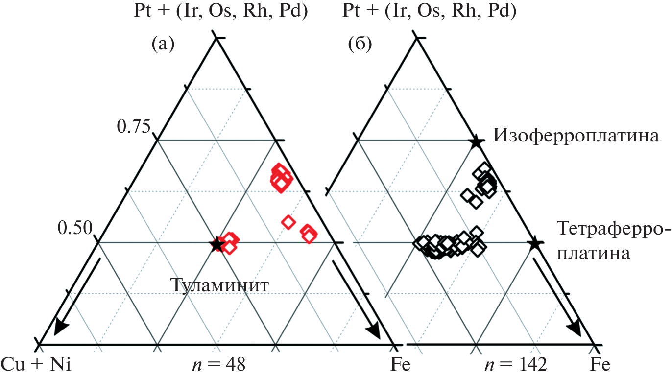 С целью идентификации источника меди впервые в мировой практике охарактеризованы особенности Cu-изотопного состава Pt–Fe-минералов Нижнетагильского массива на Среднем Урале – мирового эталона зональных комплексов уральского типа. Для выявления химического и изотопного состава Pt–Fe-минералов использованы методы, включающие рентгеноспектральный микроанализ, химическую пробоподготовку с селективным выделением меди из раствора исследуемого образца и последующим высокоточным определением значения δ65Cu с помощью мультиколлекторной масс-спектрометрии с индуктивно-связанной плазмой. Подавляющее большинство минералов платиновой группы (МПГ) из коренных месторождений Нижнетагильского массива, представленных хромититами Александровского и Крутого логов, образованы Pt–Fe-минералами, среди которых доминирует высокотемпературная железистая платина (Pt2Fe) с включениями Os–Ir-сплавов и лаурита (RuS2). Концентрации меди в изученных образцах железистой платины изменяются в пределах 0.4–1.4 мас. % Cu. Значения δ65Cu для данных Cu-содержащих МПГ варьируют в диапазоне от –0.37 до 0.26‰. Наложенный низкотемпературный парагенезис МПГ представлен твердыми растворами ряда тетраферроплатина (PtFe) – туламинит (PtFe0.5Cu0.5). Концентрации меди в данных МПГ варьируют в пределах 6.8–11.3 мас. %; значения δ65Cu характеризуются облегченными изотопными составами меди в диапазоне от –1.15 до –0.72‰. Облегчение изотопного состава меди во вторичных Cu-содержащих МПГ по сравнению с таковым в железистой платине (δ65Cu = –1.01 ± 0.17‰, n = 8 и δ65Cu = 0.03 ± 0.23‰, n = 7 соответственно) свидетельствует о вторичной природе изотопных вариаций, обусловленных эволюцией состава рудообразующего флюида при низкотемпературном формировании минералов ряда тетраферроплатина (PtFe) – туламинит (PtFe0.5Cu0.5).
