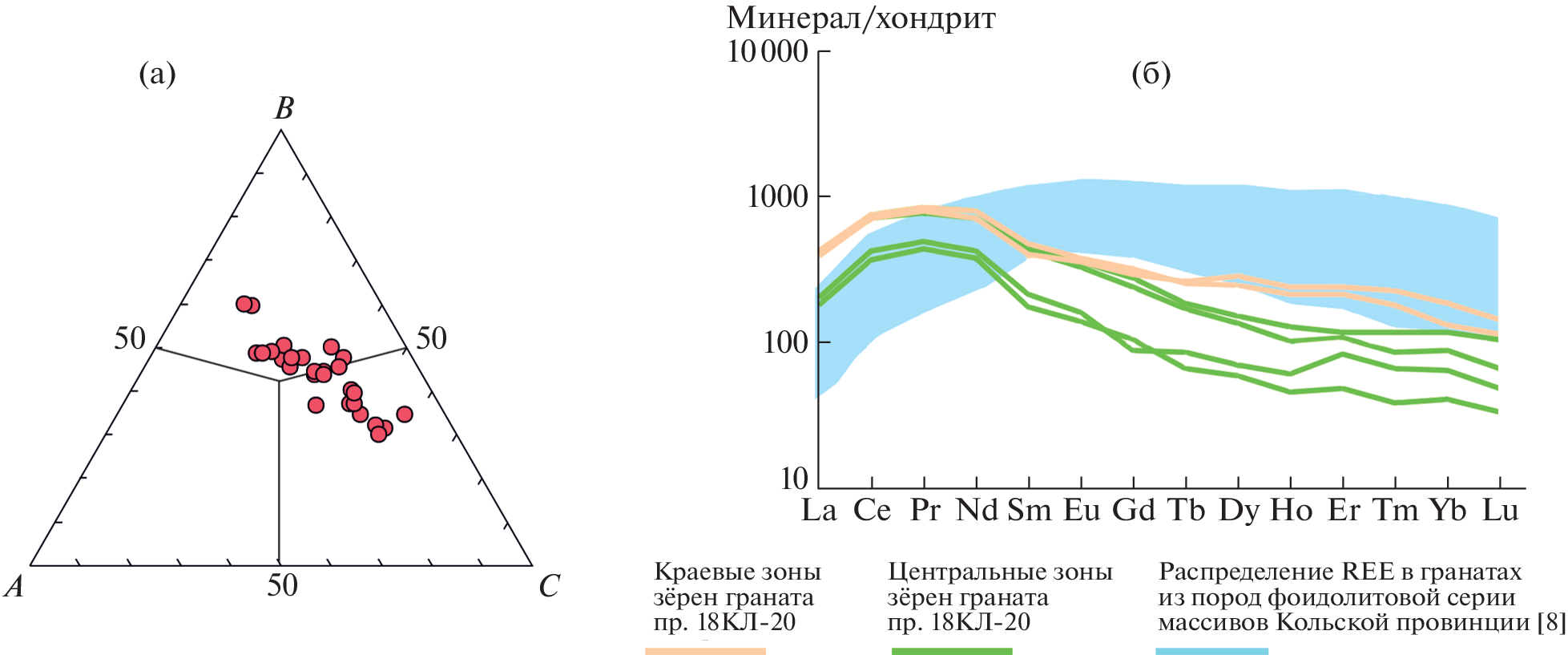 U–Pb (ID-TIMS) geochronological studies of garnet from aillikites of the Kandalaksha dyke swarm (Kola alkaline province) were carried out. The obtained estimate of the U–Pb age of the garnet (374 ± 3 MA) coincides with the interval (373–377 MA) of the main stage of alkaline magmatism of the Kola province (LIP). This allows us to conclude that the formation of rocks of the dike complex of the Kandalaksha Bay and rocks of the phoidolite series of alkaline-ultrabasic massifs of this province is synchronous.