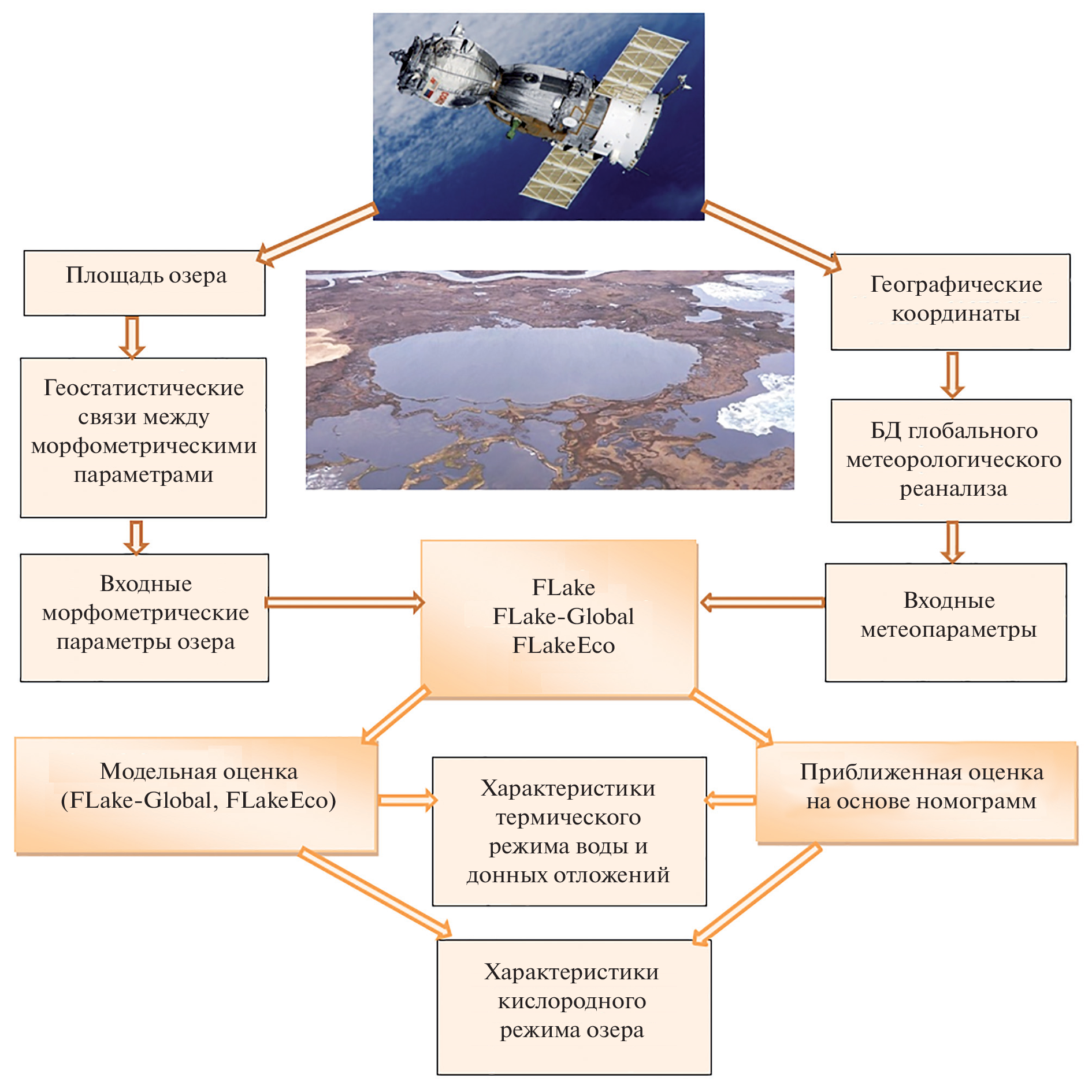 A methodology has been proposed to assess the hydrophysical and chemical-biological characteristics of unexplored small and medium lakes (with an area of up to 100 km2) in the Arctic territories of Russia using remote sensing and mathematical modeling methods. The methodology is based on the use of a one-dimensional model of hydrothermodynamic and chemical-biological processes in water bodies FLake. The technique makes it possible to obtain an estimate of heat transfer between the atmosphere, ice, water, and bottom sediments, the date of ice cover formation, its thickness, and duration of existence of freeze-up, calculate profiles of water and bottom sediment temperature and dissolved oxygen by depth based on information on geographical coordinates and lake’s surface area. Contact measurements are not required, which is extremely important for hard-to-reach and poorly explored northern territories of our country.