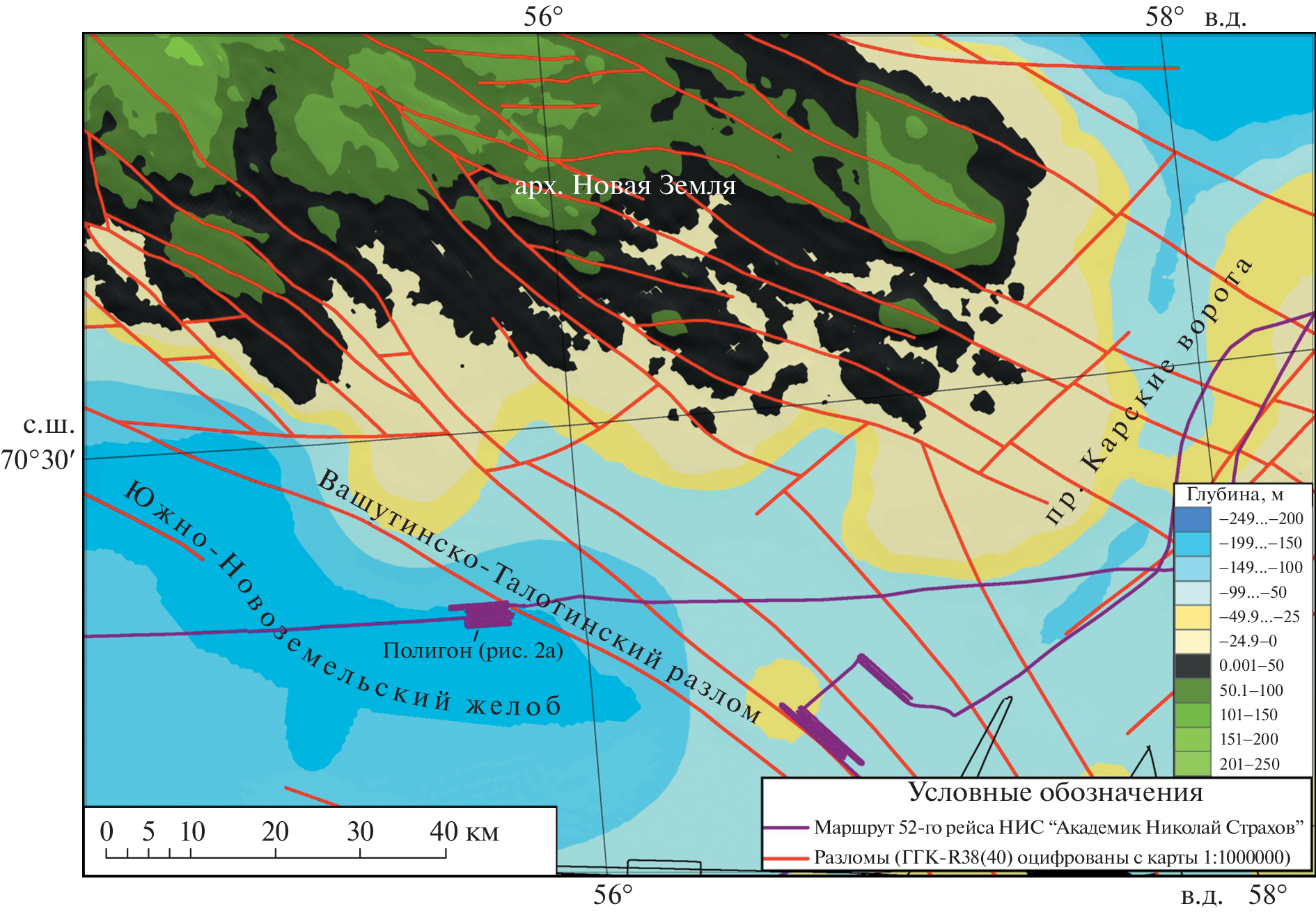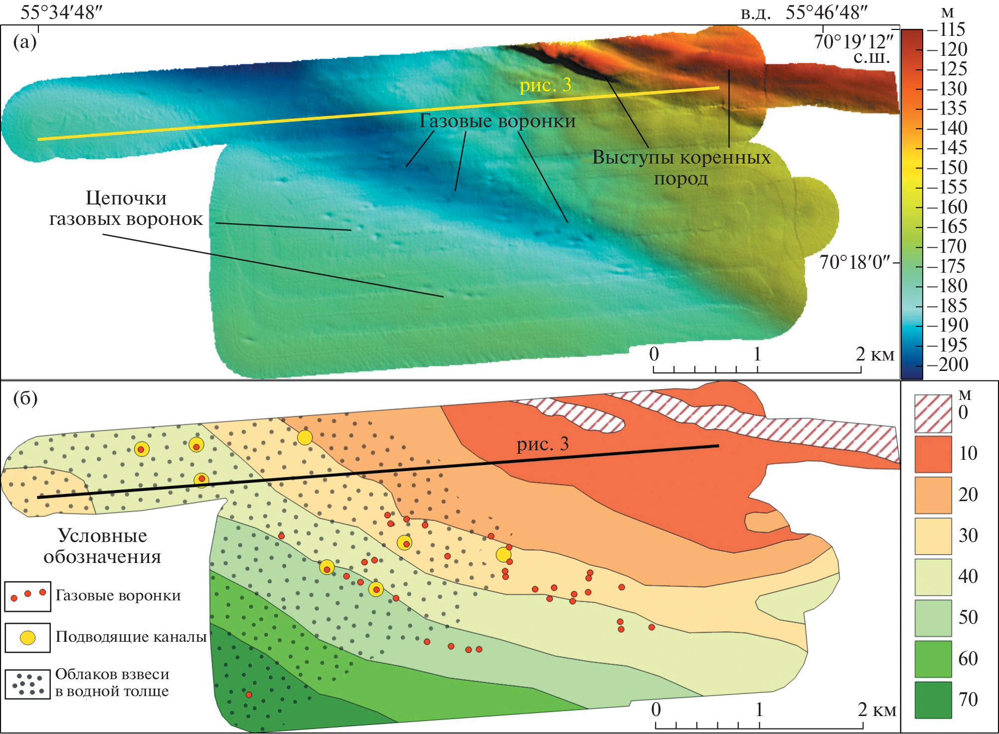 The results of detailed geological and geomorphological studies in the waters of the Pechora Sea using a complex of hydroacoustic methods in the 52 cruise of the R/V “Academic Nikolaj Strakhov” revealed numerous gas funnels (pockmarks) at the bottom of the Yuzhno-Novozemelsky trench. These forms are widespread on most of the bottom of the Barents Sea, while on the Pechora shelf there is very little information about their distribution. Analysis of seismoacoustic sections at the sites of development of gas funnels showed the presence of vertical chimneys in unconsolidated sediments of the Yuzhno-Novozemelsky trench, through which gas rises to the bottom surface and its release into the water column with the formation of negative landforms, which is accompanied by churning bottom sediments.