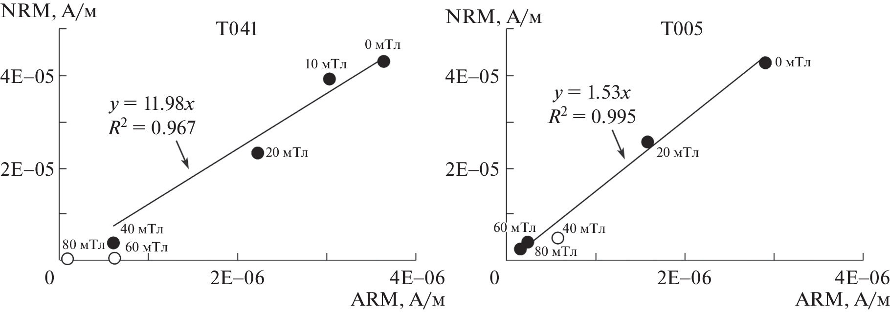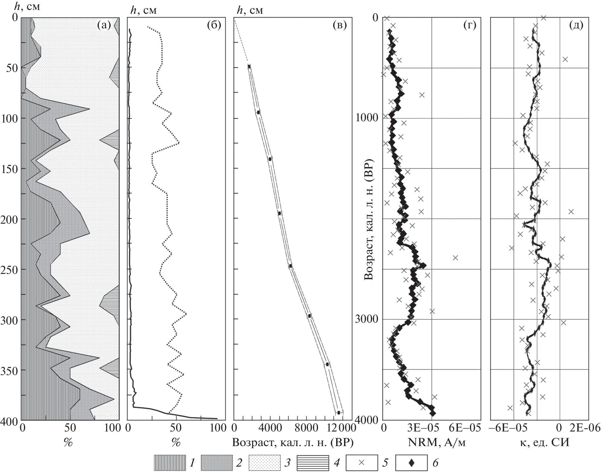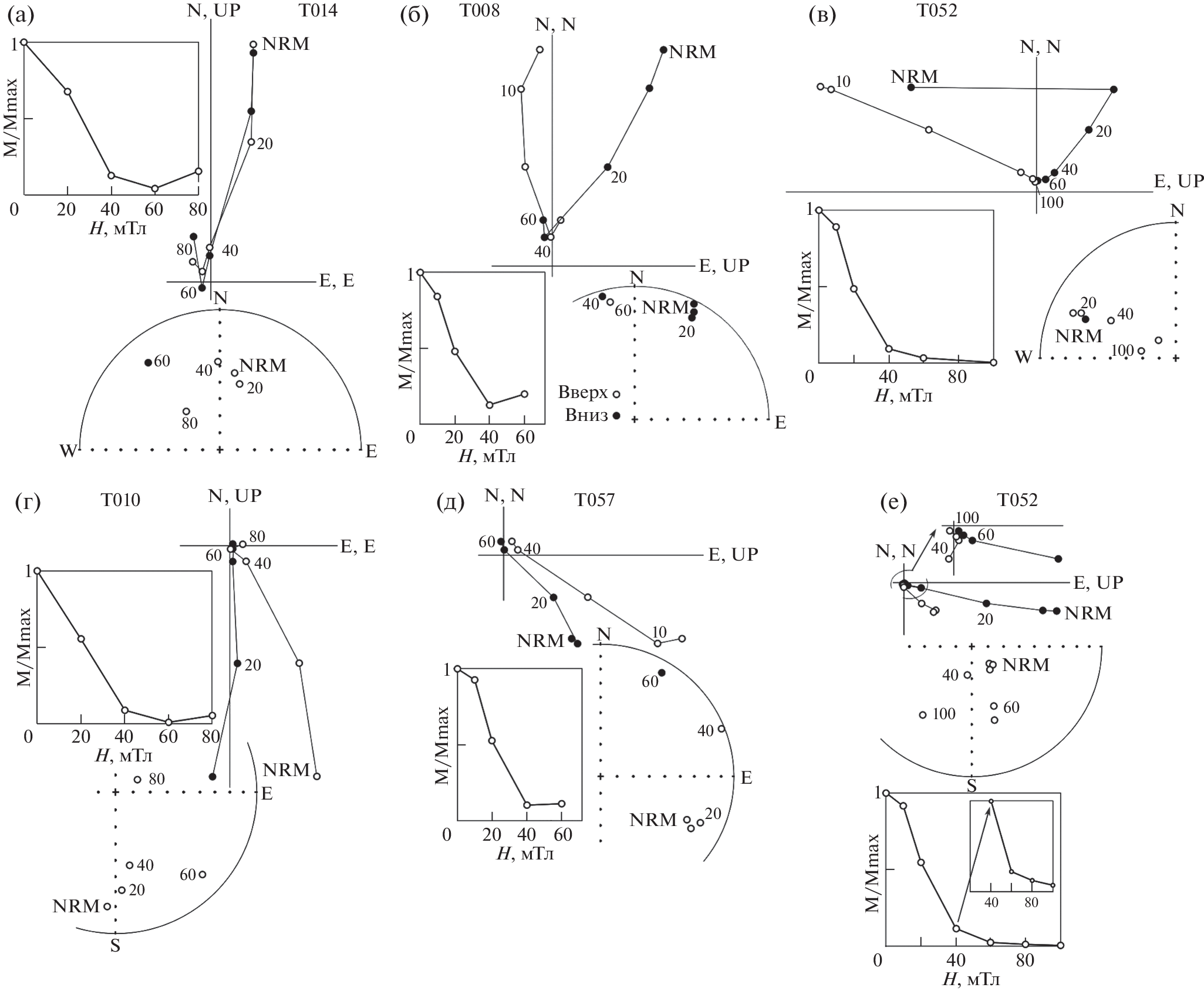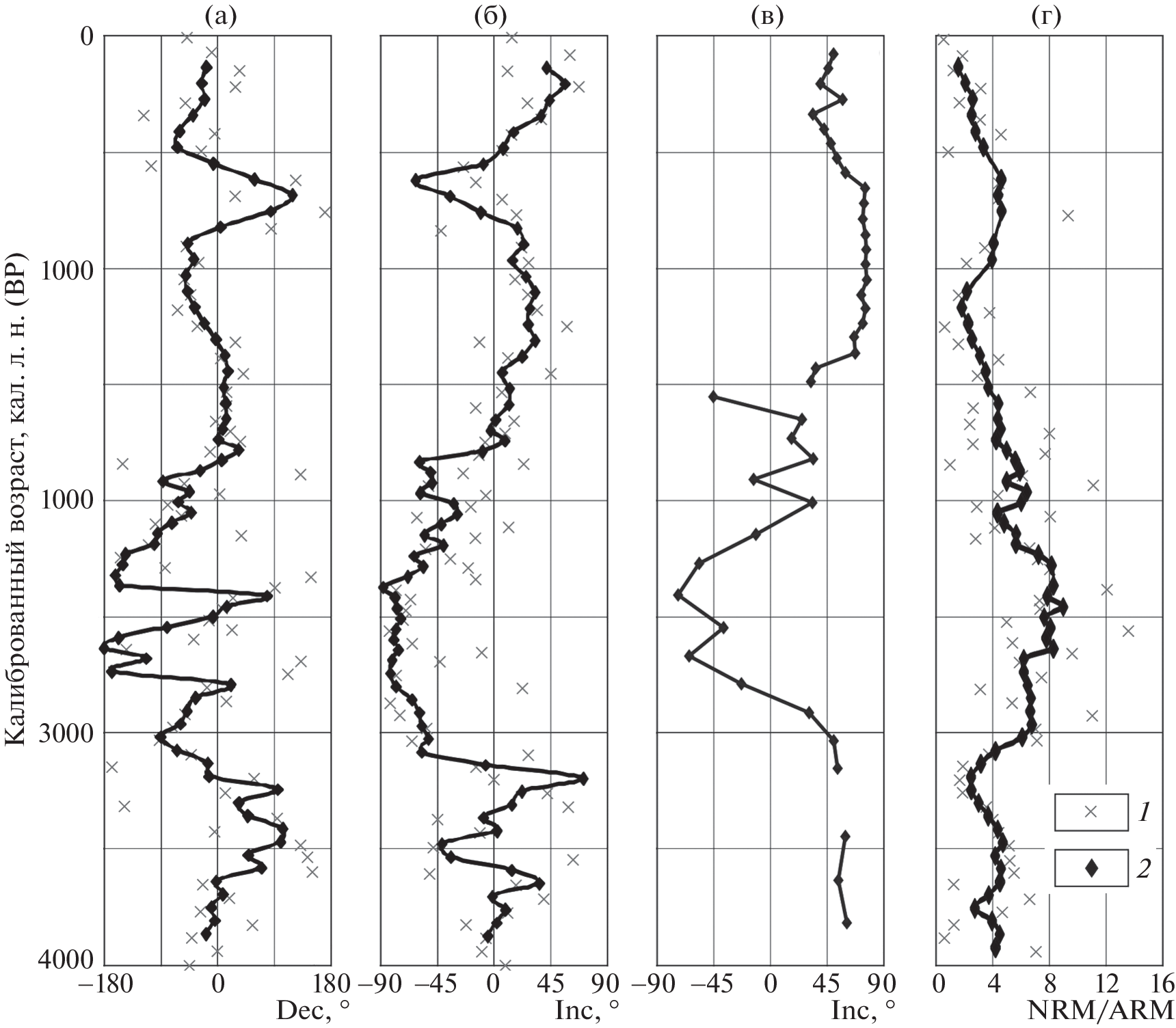 Представлены результаты микрозондовых, петро- и палеомагнитных исследований торфяного разреза “Тяпка” (Хабаровский край) до рубежа 4 тыс. лет назад. В результате проведенной магнитной чистки переменным магнитным полем в торфяниках выявлен горизонт 57–109 см (1833–3083 кал.л.н.) с отрицательными значениями наклонения вектора намагниченности, который соответствует экскурсу геомагнитного поля “Этруссия”. Впервые по торфяным отложениям рассчитаны значения относительной палеонапряженности, которые согласуются с литературными археомагнитными данными, полученными по западной части Евразии. В результате исследований установлено, что экскурс “Этруссия” происходил на фоне повышенных значений напряженности магнитного поля Земли, а его продолжительность составляла ~1200 лет.