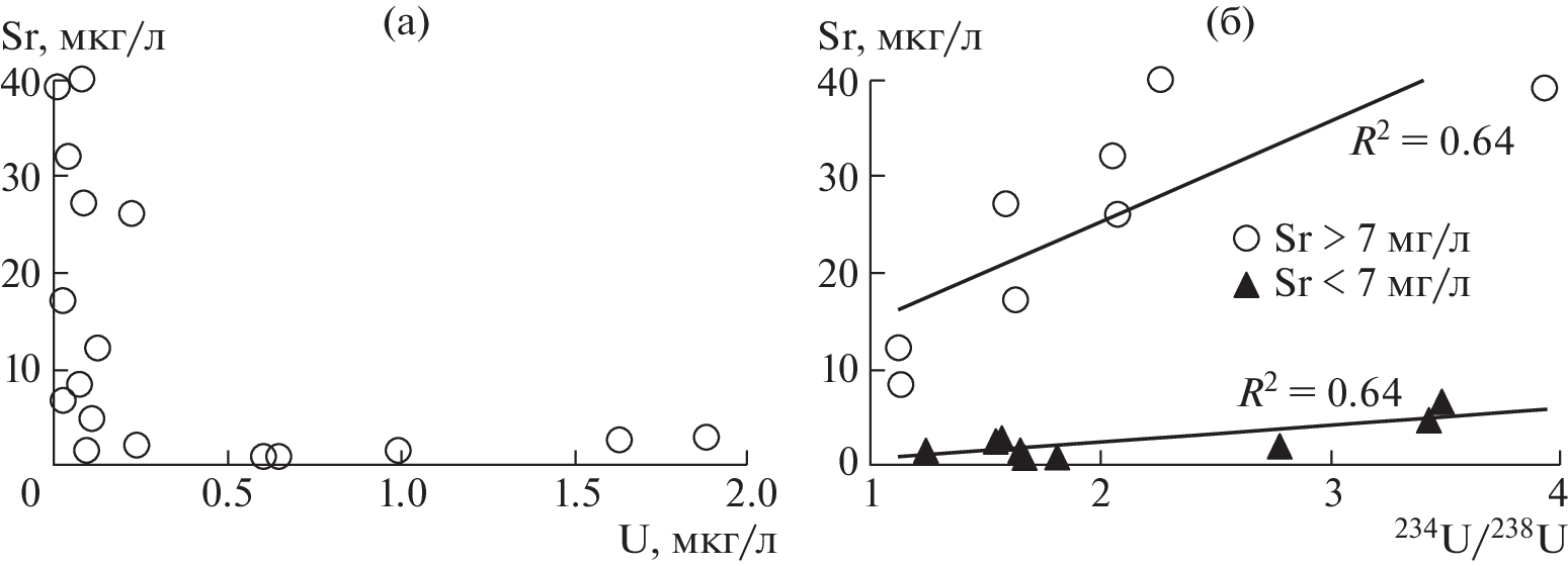 Estimates of strontium concentration factors in groundwater have been carried out in various regions of the world, however, as a rule, analyzes and interpretations were carried out for the entire set of hydrochemical data, without separating water samples with high and low strontium content. Therefore, correlations were often approximate. This study summarizes a new approach to the use of non-traditional tracers, including carbon and uranium isotopes, to study areas that are promising for drinking water supply. Water samples were divided into two clusters according to the content of strontium: 1) more than 7 mg/l, 2) less than 7 mg/l, and the goal was to understand the features of the formation of Sr concentrations for each cluster separately. It was found that in the samples of the first cluster there is a high correlation of Sr and total mineralization, along with a correlation of Sr with SO\(_{4}^{{2 - }}\), which may be due to high concentrations of Sr in carbonates with a high content of gypsum and celestite. The dedolomitization processes and the presence of reducing conditions in aquifers also have an effect. An increase in Sr concentrations due to upwelling of brackish water is not confirmed. In samples from the second cluster, low concentrations of Sr are associated with oxidative conditions in aquifers. No correlation was found between Sr and total mineralization due to low and discrete concentrations of gypsum and celestite in carbonates. There was no effect of dedolomitization. The upwelling of brackish water, on the contrary, can have a significant effect on the increase in Sr concentrations.