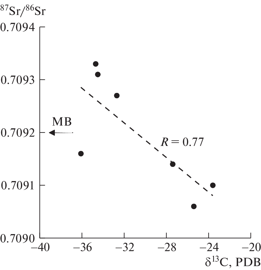 The article describes the first find of authigenic carbonates on the southern flank of the Gakkel Ridge in the zone of its junction with the Laptev Sea continental margin of the Russian Federation. The samples are represented by dense magnesian calcites and aragonites, including rounded and angular fragments of terrigenous material, as well as microphytoplankton of different ages, spores and pollen of terrestrial and aquatic plants. Elemental and organochemical characteristics indicate the predominance of oxidizing or intermediate between oxidizing and reducing conditions of carbonate crystallization, which may be a consequence of their formation near the bottom surface. The isotopic composition of O, C, and Sr allows us to conclude that the diagenetic carbonates of the Gakkel Ridge were deposited mainly in isotopic equilibrium with bottom water at a temperature of about 0°C, which corresponds to measurements from the ship. A wide range of δ13С (–23.5 до –37.3) indicates that methane was an important, but not the only source of carbon in carbonates. The wide variations in the 87Sr/86Sr (0.70906–0.70933), which correlate with the δ13С values, show that the carbonate-forming fluid was not only modern sea water, but also diagenetic solutions coming from the sedimentary cover together with methane and the products of methane and organic matter oxidation. Intense discharge of heterogeneous methane-bearing fluids may be related to the high modern tectonic activity of the studied region.