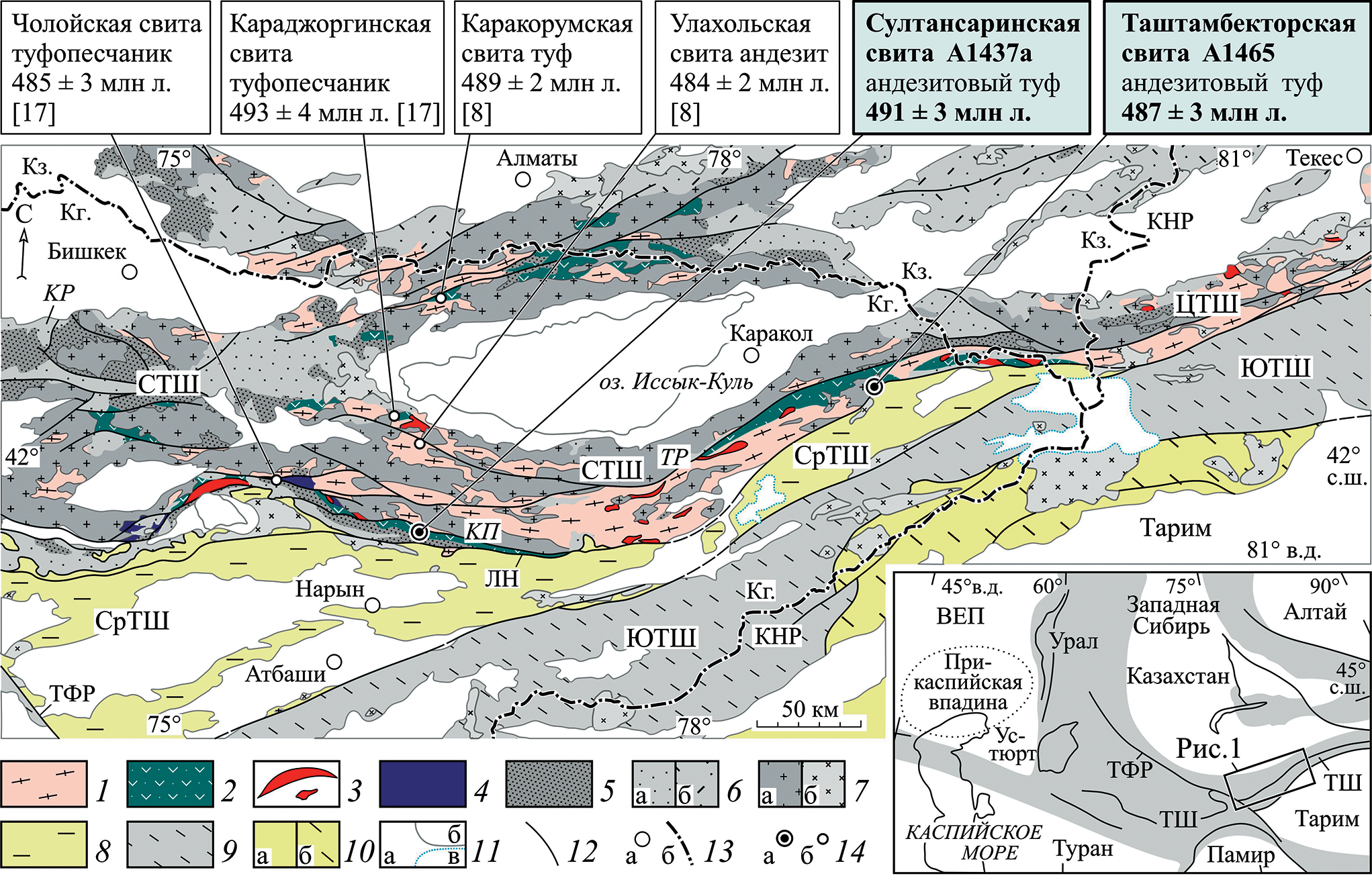 - Alexeiev D.V., Kröner A., Kovach V.P., Tretyakov A.A., Rojas-Agramonte Y., Degtyarev K.E., Mikolaichuk A.V., Wong J., Kiselev V.V. Evolution of Cambrian and Early Ordovician arcs in the Kyrgyz North Tianshan: Insights from U−Pb zircon ages and geochemical data // Gondwana Res. 2019. V. 66. P. 93–115.