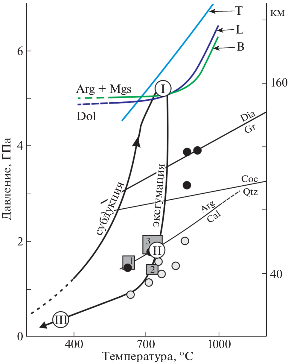 In garnet peridotites of the Marunkeu eclogite-gneiss complex (Polar Urals), segregations of carbonates in association with chlorapatite were first established. They contain relics of dolomite, which is “replaced” by calcite with symplectite (graphic) intergrowths of brucite and hydrocarbonate. The formation of peridotites with unusual carbonate structures is the result of the evolution of this complex at different depths. During deep subduction and progressive with the formation of garnet peridotites, segregated dolomite experienced a solid-phase breakdown into aragonite and magnesite at the pressure peak (≥5 GPa). During exhumation and retrograde metamorphism, garnet peridotites, together with segregations, underwent low-temperature transformations; aragonite was replaced by calcite, and magnesite by brucite and hydrocarbonate. The presence of carbonates with deep-seated structures confirms that the garnet peridotites and eclogites of the Polar Urals belong to ultrahigh-pressure complexes.