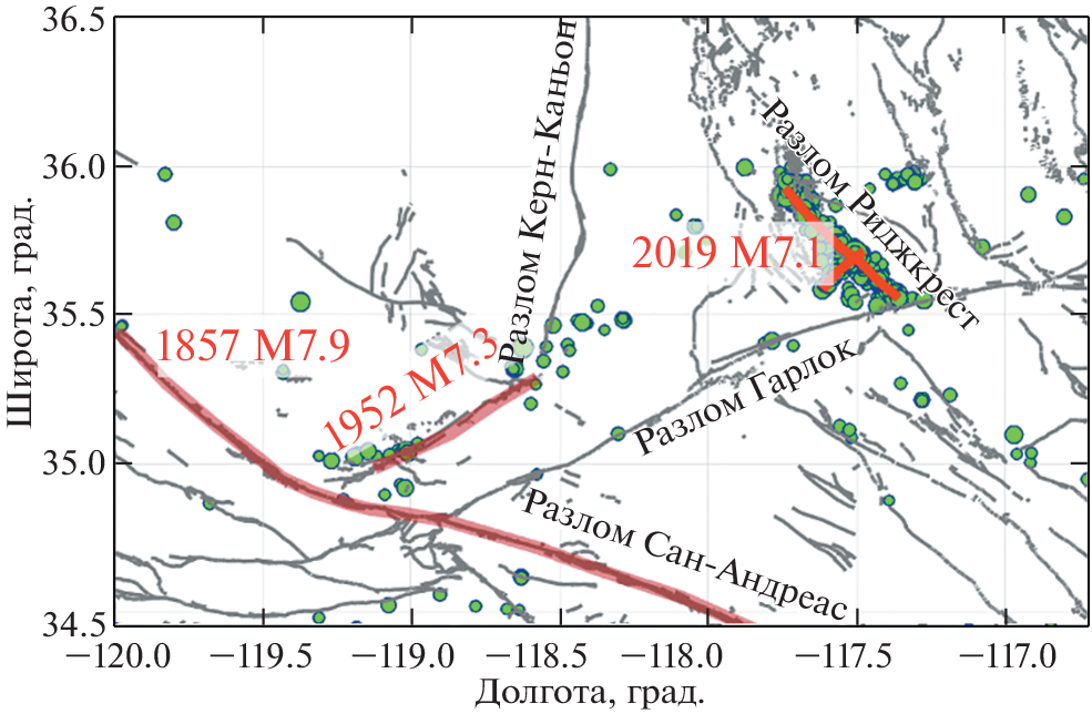 - Li S., Chen G., Tao T., He P., Ding K., Zou R., Li J., Wang Q. The 2019 Mw 6.4 and Mw 7.1 Ridgecrest earthquake sequence in Eastern California: rupture on a conjugate fault structure revealed by GPS and InSAR measurements // Geophys. Journ. Int. 2020. V. 221 № 3. P. 1651–1666. https://doi.org/10.1093/gji/ggaa099