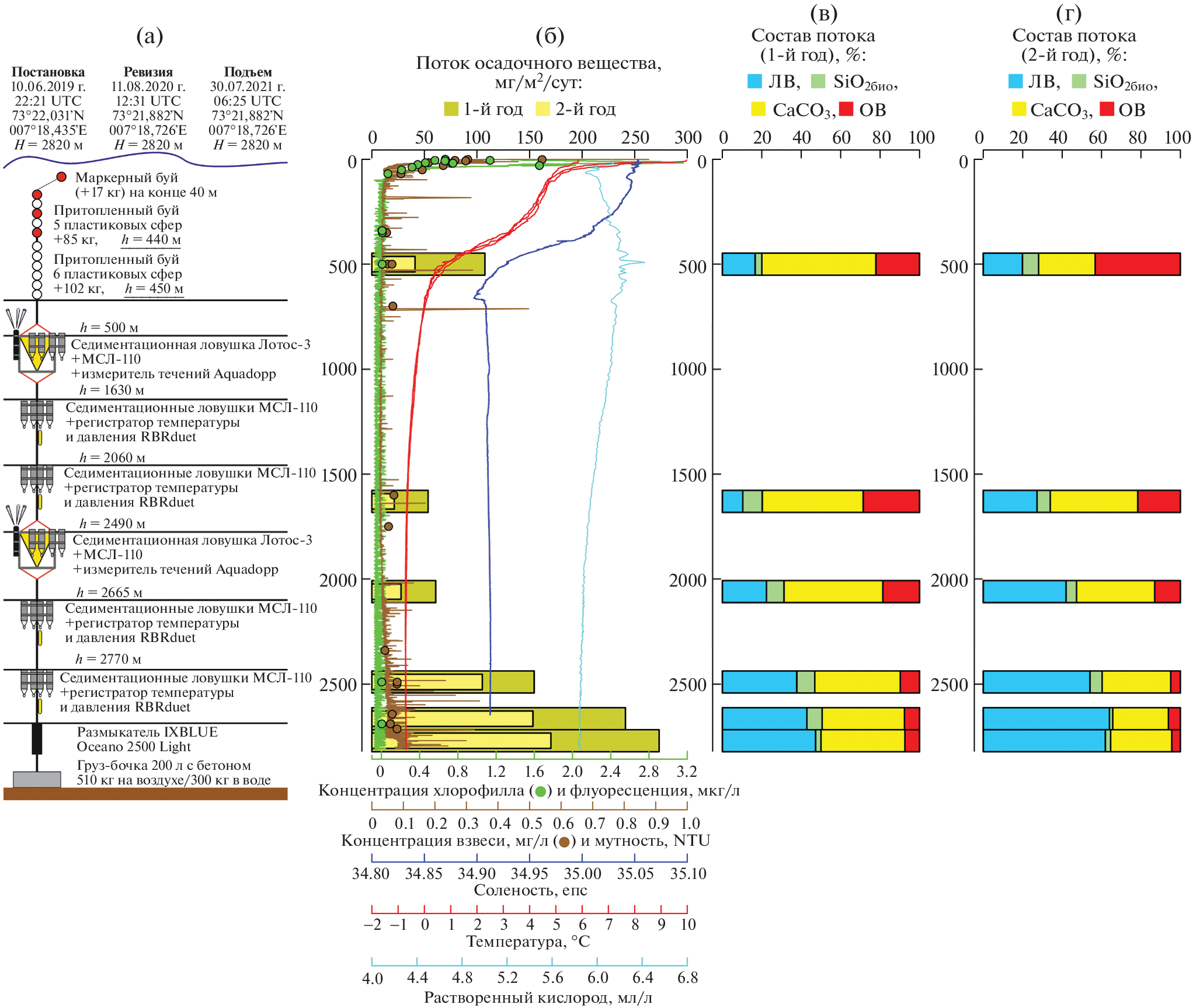 For the first time, a continuous two-year study of the particle fluxes and associated environmental parameters in the axial zone of the Arctic segment of the Mid-Atlantic Ridge at the junction of the Mohns and Knipovich Ridges (Norwegian Sea) was carried out. Sediment traps were deployed from the R/V Akademik Mstislav Keldysh in June 2019 in the northeastern part of the Mohns Ridge and realized in July 2020. It was shown that the sedimentation of sinking particles in the study area was influenced by the global transport of water masses in the northeastern direction, with Atlantic waters in the subsurface, and water masses of Arctic origin recirculating deeper in the subsurface. A weak positive temperature trend at a depth of more than 2500 m (0.02°C) is detected. The bimodal vertical distribution of fluxes and changes in the composition of sinking particles corresponded to the pattern of sediment recycling in the ocean. The annual course of fluxes in the subsurface layer was determined by the activity of silicon-concentrating and calcifying plankton, with the maximum bloom period also manifested in the deep layer. At the same time, the main significant moderator of flux deeper than 2000 m is the inflow of lithogenic matter from the benthic nepheloid layer.