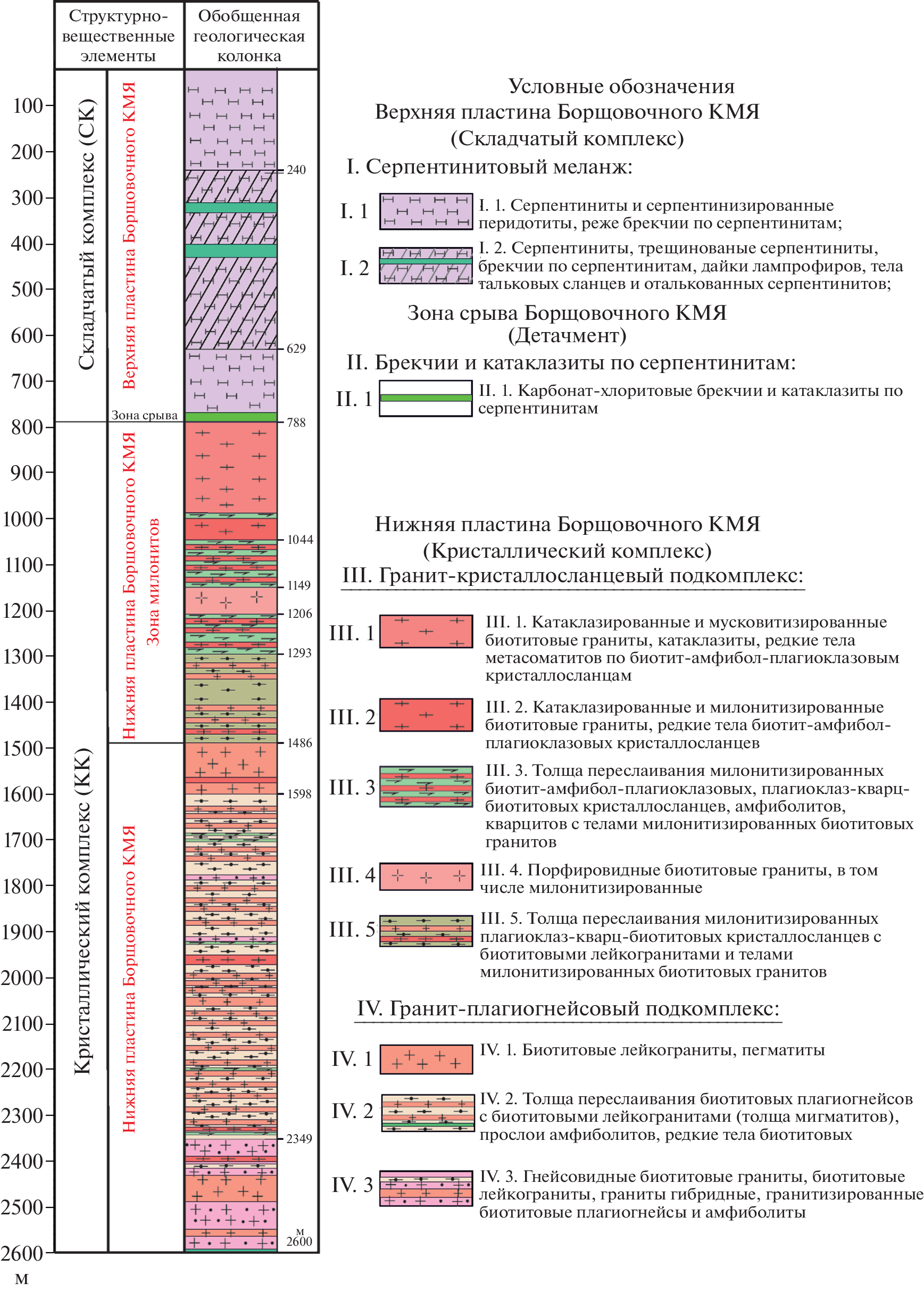 The Zabaikalian parametric borehole drilled out a metamorphic core complex on the reference geological and geophysical profile within the Central Asian fold belt, south of the Mongol-Okhotsk suture zone. In the section of the borehole drilled to a depth of 2600 m, a set of geophysical, geological and laboratory-analytical studies identified three main structural elements of metamorphic core complexes: the upper plate, detachment, and the lower plate. The upper plate (weakly metamorphosed rocks) is represented by serpentinite melange, which is separated from the underlying rocks of the lower plate by a zone of chlorite breccias (detachment). The lower plate, which is part of the crystalline basement complex, includes rocks of granite-schist and granite-plagiogneiss subcomplexes. The granite-schist subcomplex is composed of mafic and intermediate schist with amphibolites and quartzites. Biotite granite is widespread in the section; it forms layered veins with signs of synkinematic formations. According to preliminary estimates, the age of biotite granite is about 130 Ma. The schist is characterized by mylonite structure at intervals of interbedding with biotite granite veins. In accordance with data of geophysical surveys in the borehole and the petrophysical characteristics of cored rocks, the mylonite zone is the provenance of a series of inclined reflectors on the seismic reflection-CDP section, which can be traced to a depth of at least 10 km. The granite-plagiogneiss subcomplex is represented by plagiogneiss, leucogranites, and gneissic granites. In the Zabaikalian parametric borehole, a detailed section of the orshchovochny metamorphic core complex, fully characterized by core samples, of the was obtained, which should be considered as a reference for studying these structures. The investigation of this section will answer later many questions about the formation and evolution of the Central Asian fold belt.