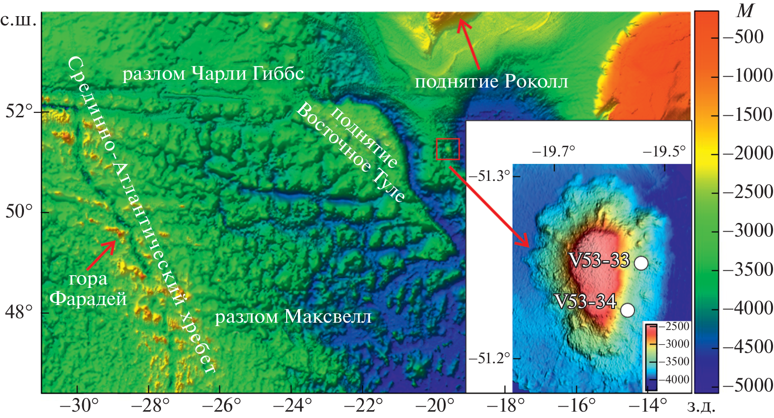 Изучен состав базальтов, полученных со склонов одиночной подводной горы, являющейся гайотом и расположенной южнее восточного окончания разлома Чарли Гиббс в Северной Атлантике. Выделены группы высоко- и низкотитанистых разностей, относящихся соответственно к океаническим толеитам E-MORB и T-MORB. Базальты первой группы отличаются более высокими концентрациями TiO2, Na2O, K2O, P2O5, Fe2O3 и некогерентных элементов-примесей. Базальты обеих групп имеют близкий характер распределения нормированных литофильных элементов, что свидетельствует о том, что они выплавлялись из мантийного субстрата близкого состава. Наблюдающееся различие в их составе, возможно, обусловлено тем, что высокотитанистые вулканиты выплавлялись в более глубинном горизонте на промежуточном уровне между шпинелевой и гранатовой фациями глубинности. Проведенные исследования дают основание полагать, что изученная гора также формировалась как крупное неовулканическое поднятие 64–67 млн лет назад под влиянием микроплюма, являвшегося ответвлением плюма глубинной мантии Милна.