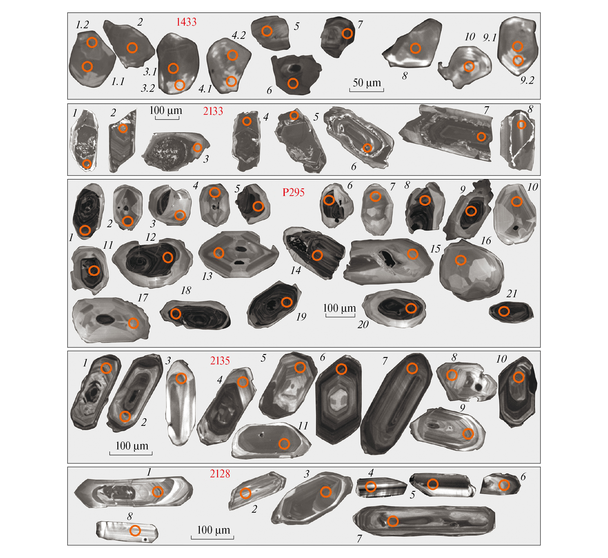 Рис. 3. Катодо-люминесцентные микрофотографии кристаллов акцессорного циркона из проб 1433, 2133, р295, 2135, 2128. Номера точек соответствуют номерам анализов в табл. 2.