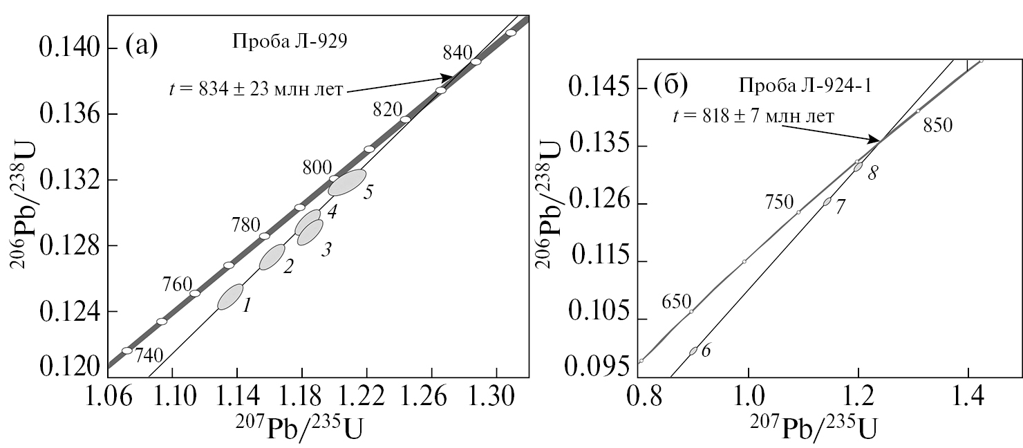 U–Pb-геохронологические исследования проведены для пяти микронавесок циркона. При этом был использованы как необработанные, наиболее прозрачные и идиоморфные кристаллы циркона (№ 1–3; табл. 1), так и зерна, подвергнутые различной степени (15–50%) аэроабразивной обработки (№ 4, 5; табл. 1). Как видно на рис. 3, точки изотопного состава изученного циркона № 1, 2, 4, 5 располагаются на дискордии, верхнее пересечение которой с конкордией отвечает возрасту 834±23 млн лет (нижнее пересечение равно 328±200 млн лет, СКВО=0.17). Принимая во внимание морфологические особенности изученного циркона, указывающие на его магматическое происхождение, есть все основания полагать, что значение возраста 834±23 млн лет соответствует возрасту кристаллизации трахириолитов.