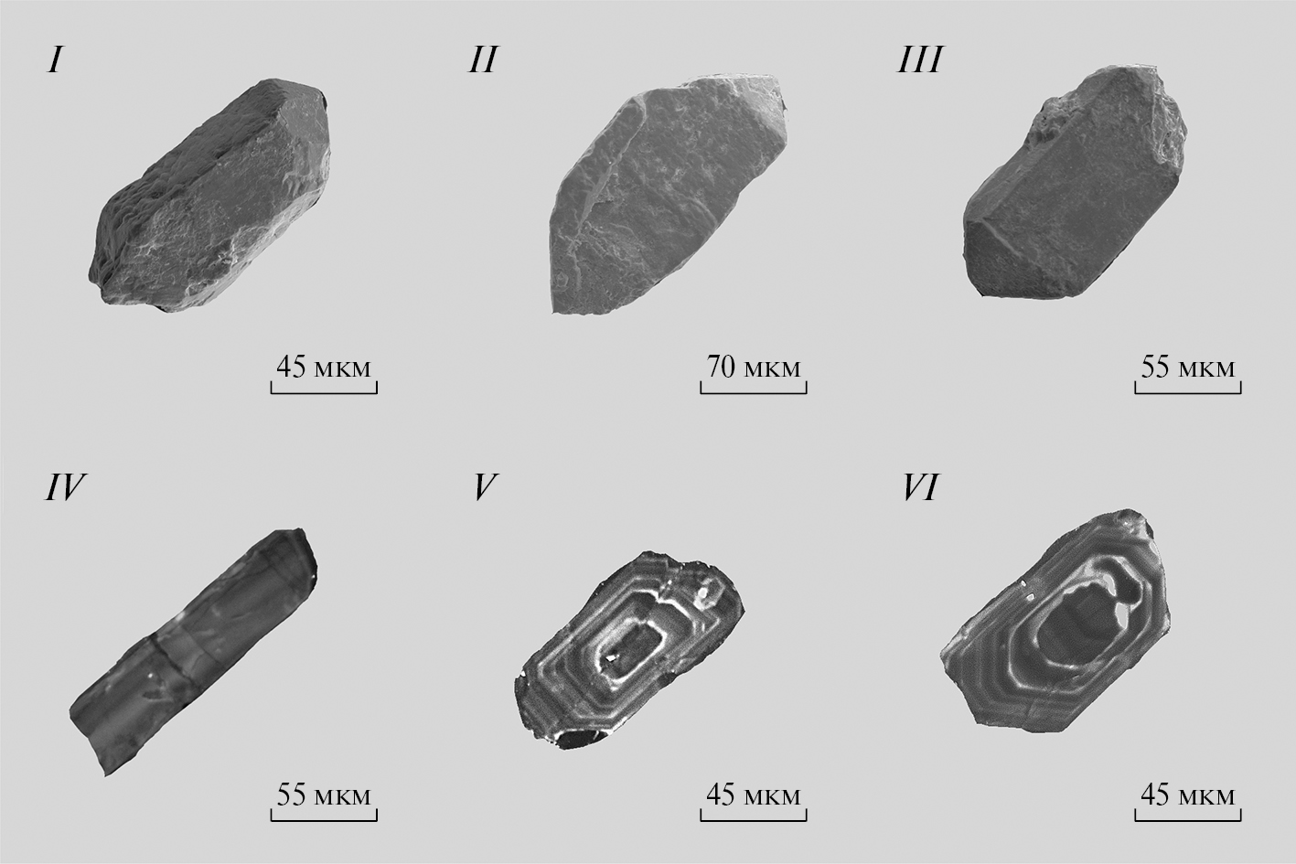 5. Fig. 4. Micrographs of zircon crystals from biotite leukogranite of the Bamboo complex (sample No. L‑934–1), performed on an ABT‑55 scanning electron microscope. I–III – in the mode of secondary electrons, IV–VI – in the mode of cathodoluminescence.