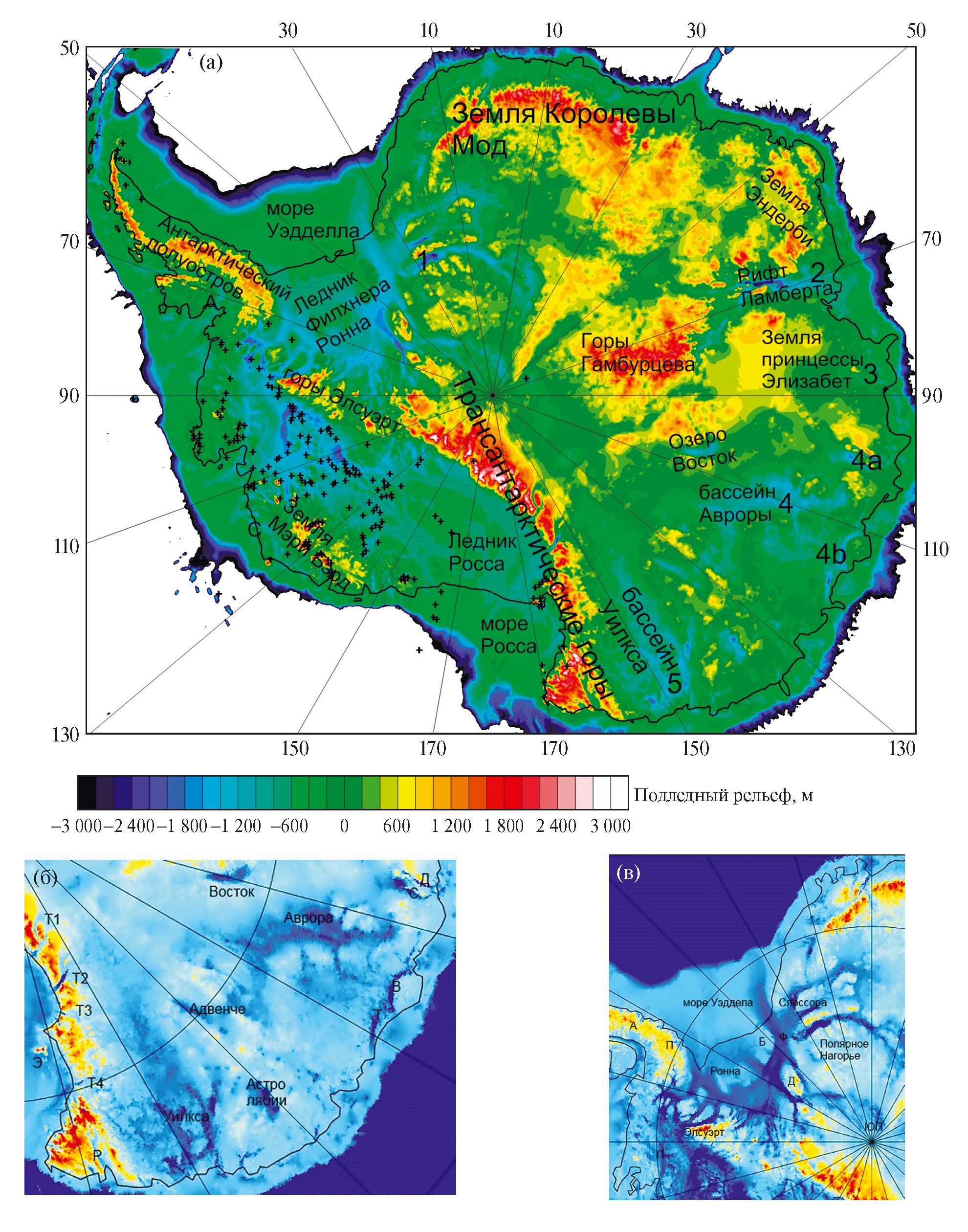 В Антарктиде выявлены узкие впадины, по всей видимости, рифтогенной природы, характеризующиеся аномально большими глубинами до 3 км, которые не встречаются на других континентах. Объяснение этого феномена Антарктиды естественно связать с позднекайнозойской активизацией рифтогенеза уже после оледенения континента. Уникальность ситуации для ледяного континента заключается в том, что после оледенения происходит прекращение осадконакопления. Продолжение рифтогенеза в этих условиях приводит к формированию узких глубоких подледных впадин, заполненных льдом. На других континентах при отсутствии ледяного покрова в рифтовых впадинах происходит достаточно интенсивное осадконакопление, компенсирующее погружение коры при рифтогенезе, которое сглаживает поверхностный рельеф. Таким образом, наличие узких и глубоких впадин подледного рельефа Антарктиды является свидетельством продолжающегося рифтогенеза после оледенения континента. На рис. 1 а показан подледный рельеф Антарктиды согласно [1].