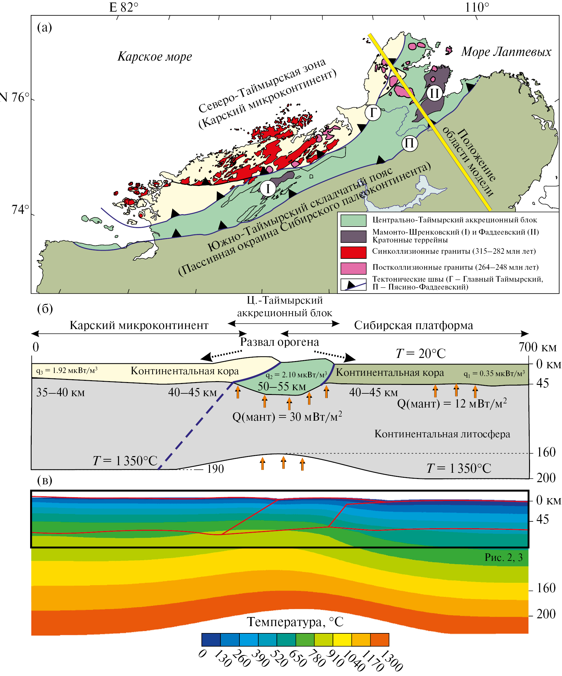 Ранее тектонотермальная модель была разработана авторами только для синколлизионного этапа формирования Карского орогена, в течение которого произошло образование анатектических гранитов с возрастом 315–282 млн лет [1]. В настоящей статье главное внимание уделено эволюции постколлизионного магматизма в орогене на рубеже перми и триаса. Наличие многочисленных тел аллохтонных гранитоидов в Карском орогене с возрастом 265–248 млн лет, предшествующем событию массового излияния Сибирских траппов (~250 млн лет), ставит задачу реконструкции термального состояния и механизмов плавления коры на “предплюмовом” этапе.
