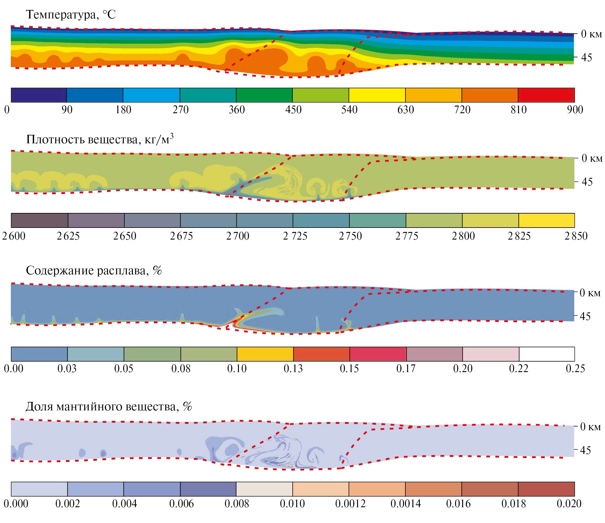 Рис. 2. Результаты расчета на момент времени действия повышенного теплового потока через 1.2 млн лет (возраст ~264 млн лет), показывающие распределение температуры, плотности вещества (2600 соответствует 25% расплава, 2800 – плотность твердой коры), доли расплава в магме, доли мантийной компоненты.
