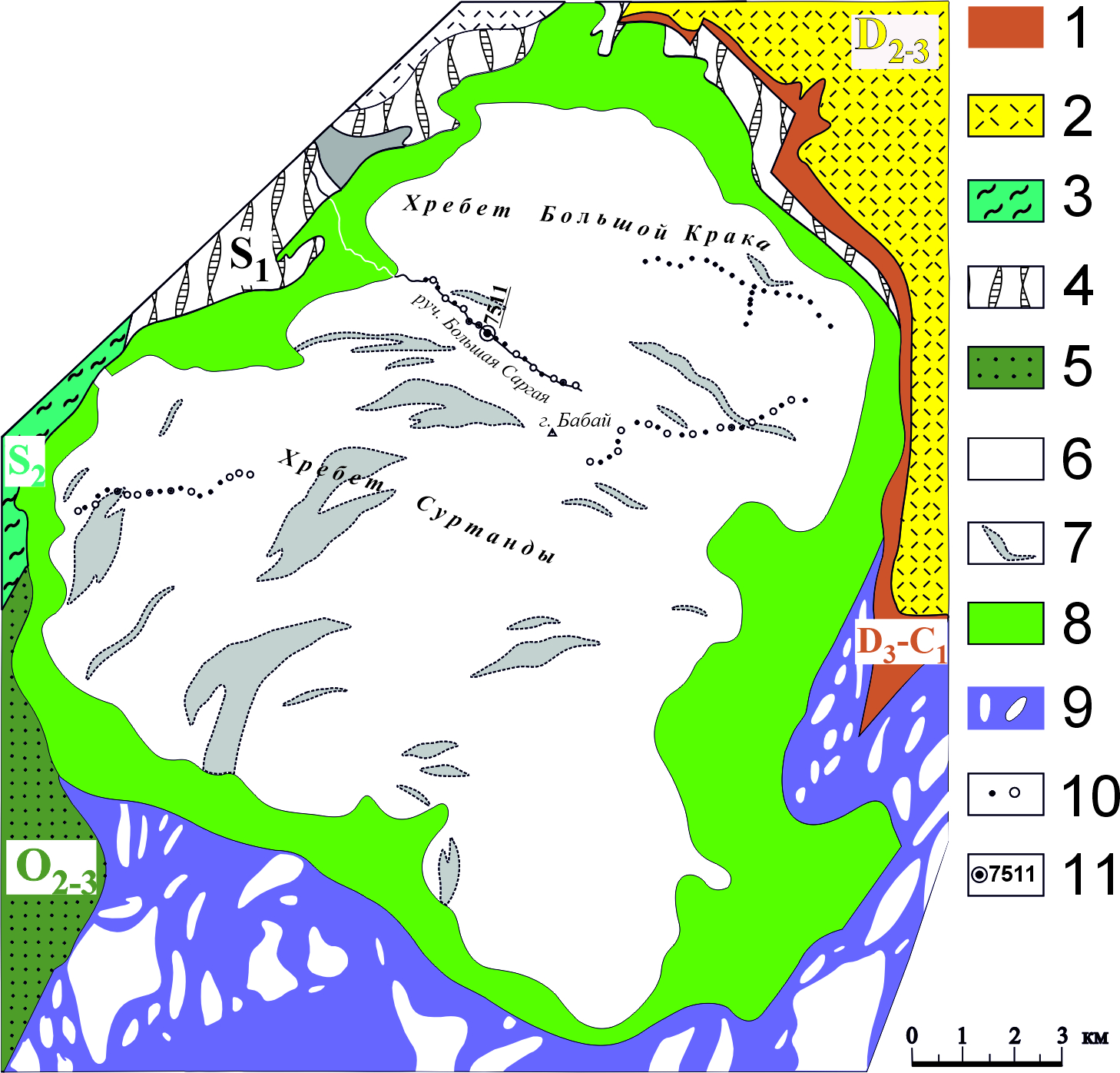 Рис. 2. Схематическая геологическая карта северного Крака. 1 – Зилаирская серия ‒ полимиктовые песчаники, алевролиты, глинистые сланцы D3-C1; 2 – известняки с прослоями песчаников и глинистых сланцев D2–3; 3 – кварцевые песчаники, алевролиты, глинистые и кремнистые сланцы S2; 4 – глинистые и кремнистые сланцы, кварцевые песчаники, алевролиты S1; 5 – кварцевые песчаники, кремнистые и глинистые сланцы O2–3; 6 – Шпинелевая фация гарцбургит-лерцолитовой серии; 7 – Плагиоклазовая фация гарцбургит-лерцолитовой серии; 8 – Хризотил-лизардитовые серпентиниты; 9 – Полимиктовый серпентинитовый меланж; 10 – места отбора образцов; 11 – образец 7511, правый борт ручья Большая Саргая.