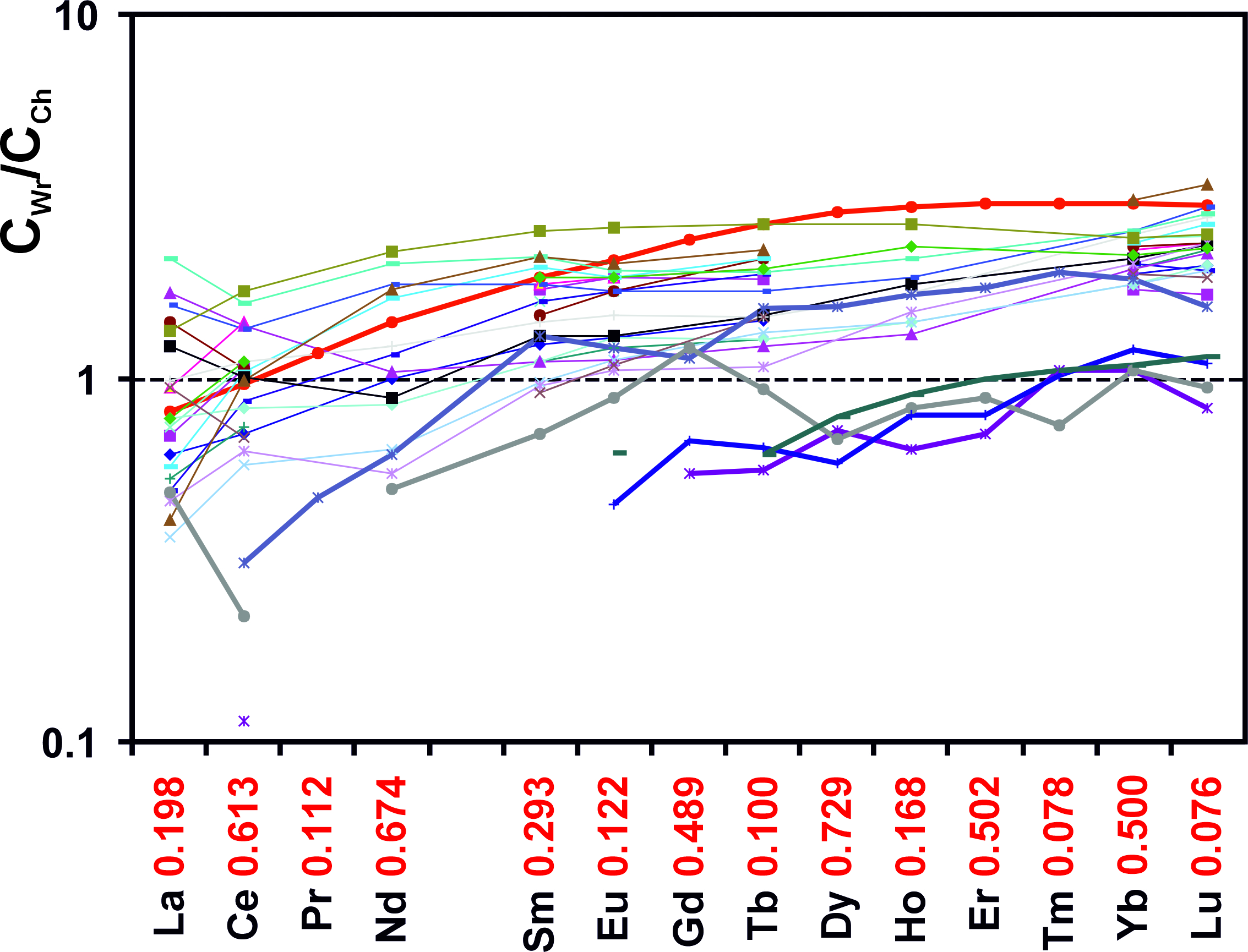 Рис. 4. Спектры распределения РЗЭ в лерцолитах. Тонкие цветные линии – лерцолиты восточных Пиреней [6]. Красная утолщенная линия характеризует спектр распределения РЗЭ образца, изученного в настоящей работе. Остальные утолщенные цветные линии – лерцолиты массивов Миндяк и Нурали, Ю. Урал, номера проб соответствуют таковым из табл. 1 [19]. CWr, CCh – концентрации РЗЭ в породе (ppm, указаны красными цифрами по оси абсцисс) и хондрите соответственно. Коэффициенты нормализации по [IX].