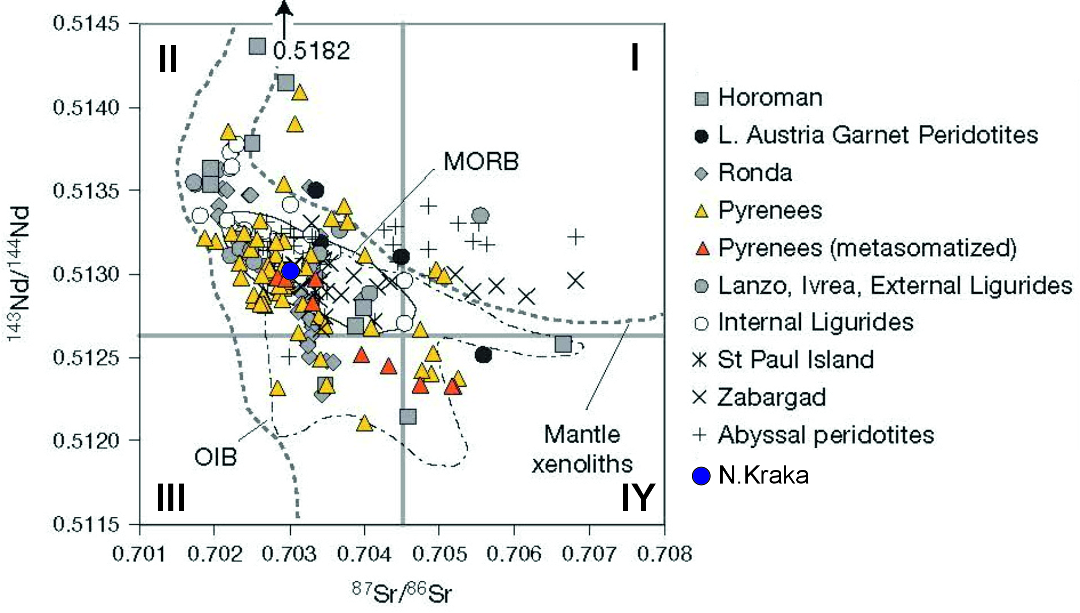 Полученные в настоящей работе РЗЭ-данные,87Sr/86Sr- и 147Sm‒143Nd-изотопная систематика шпинелевого лерцолита массива северный Крака позволяют определить источник вещества изученной породы. Об этом свидетельствует наблюдаемая корреляционная зависимость87Sr/86Sr-143Nd/144Nd (в частности, особенность положения соответствующей фигуративной точки по оси87Sr/87Sr, II квадрант графика, рис. 6), что вместе со спецификой спектра распределения РЗЭ (рис. 4) не противоречит гипотезе о происхождении изученного лерцолита вследствие плавления уже истощенного протолита, который можно идентифицировать как мантийный источник с параметрами, подобными MORB.