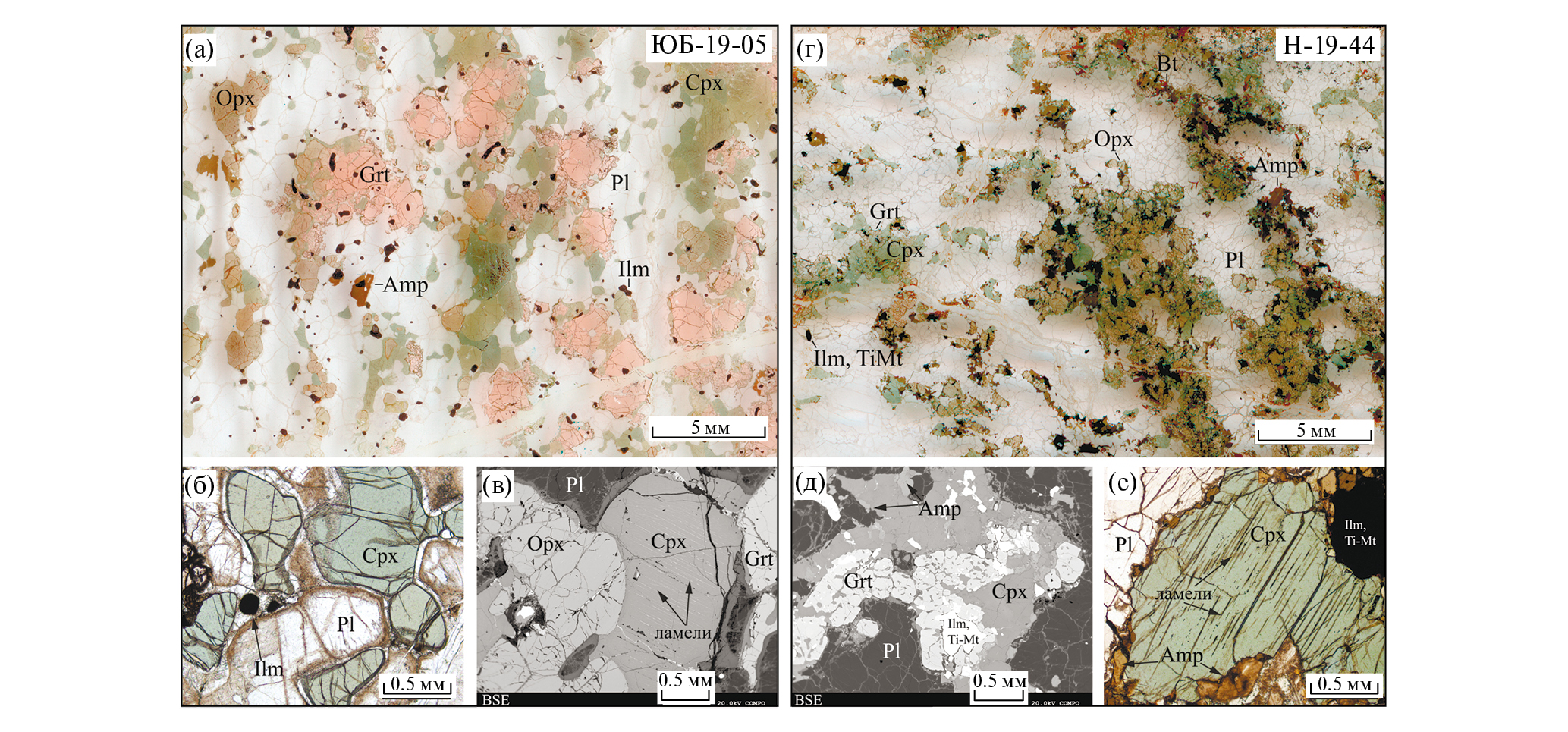 Мафические гранулиты из трубок Юбилейная (образец ЮБ-19-05) и Новинка (образец Н-19- 44) имеют массивную текстуру со слабо выраженной гнейсовидностью. Структура пород гетеробластовая, среднемелкозернистая, гранобластовая (обр. ЮБ-19-05) и лепидогранобластовая (обр. Н-19-44). Гранулиты состоят из плагиоклаза (Pl), клинопироксена (Cpx), граната (Grt) и ортопироксена (Opx) в различных пропорциях (рис. 1 а, г): в ЮБ-19-05 – Pl 55%, Grt 20%, Cpx 15%, Opx 10%; в Н-19-44 – Pl 65%, Cpx 15%, Opx 10%, Grt 10%. В акцессорных количествах в обеих породах присутствуют ильменит (Ilm), рутил (Rt) и апатит, в образце ЮБ-19-05 – амфибол (Amp), а в Н-19-44 – кварц (Q). В гранулите Н-19–44 среди акцессорных минералов также отмечены магнетит, титаномагнетит, циркон и шриланкит, регрессивными минералами являются амфибол и биотит (Bt). По жилам и краям зерен в породах развиваются вторичные хлорит и калиевый полевой шпат, связанные, вероятно, с воздействием кимберлитового расплава (рис. 1 б).