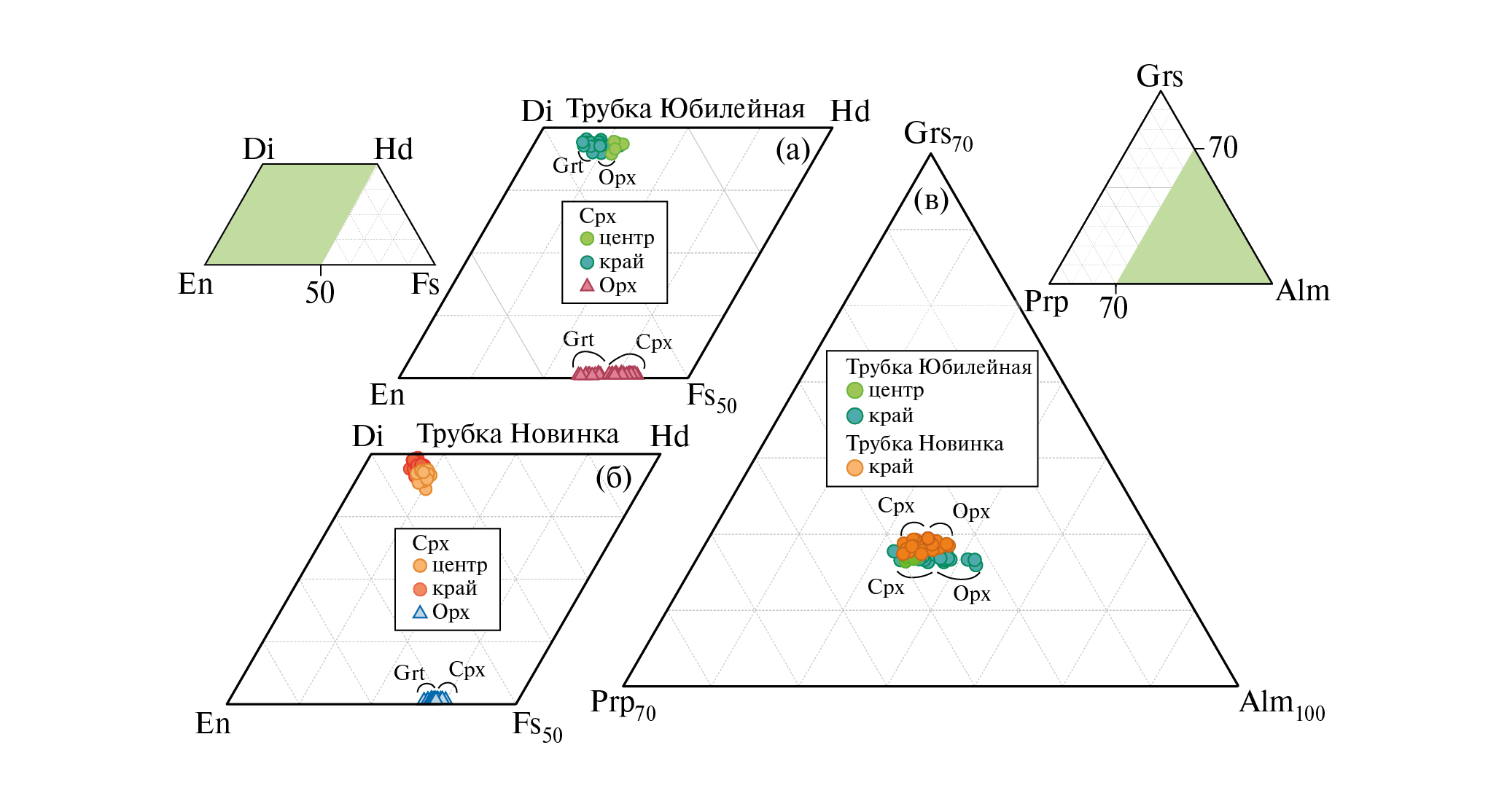 Рис. 2. а) составы клино- (Cpx) и ортопироксенов (Opx) в образце из трубки Юбилейная (ЮБ‑19-05) на фрагменте трапеции Di-Hd- En- Fs; б) составы Cpx и Opx в образце Н‑19-44 на фрагменте трапеции Di-Hd- En- Fs; в) составы гранатов (Grt) образцов ЮБ‑19-05 и Н‑19-44 на фрагменте тройной диаграммы Grs-Prp- Alm. Более магнезиальные составы Cpx соответствуют зонам контакта с Grt, более железистые – с Opx; аналогичные различия составов краевых частей зерен в зависимости от контактирующего минерала фиксируются для Opx и Grt.