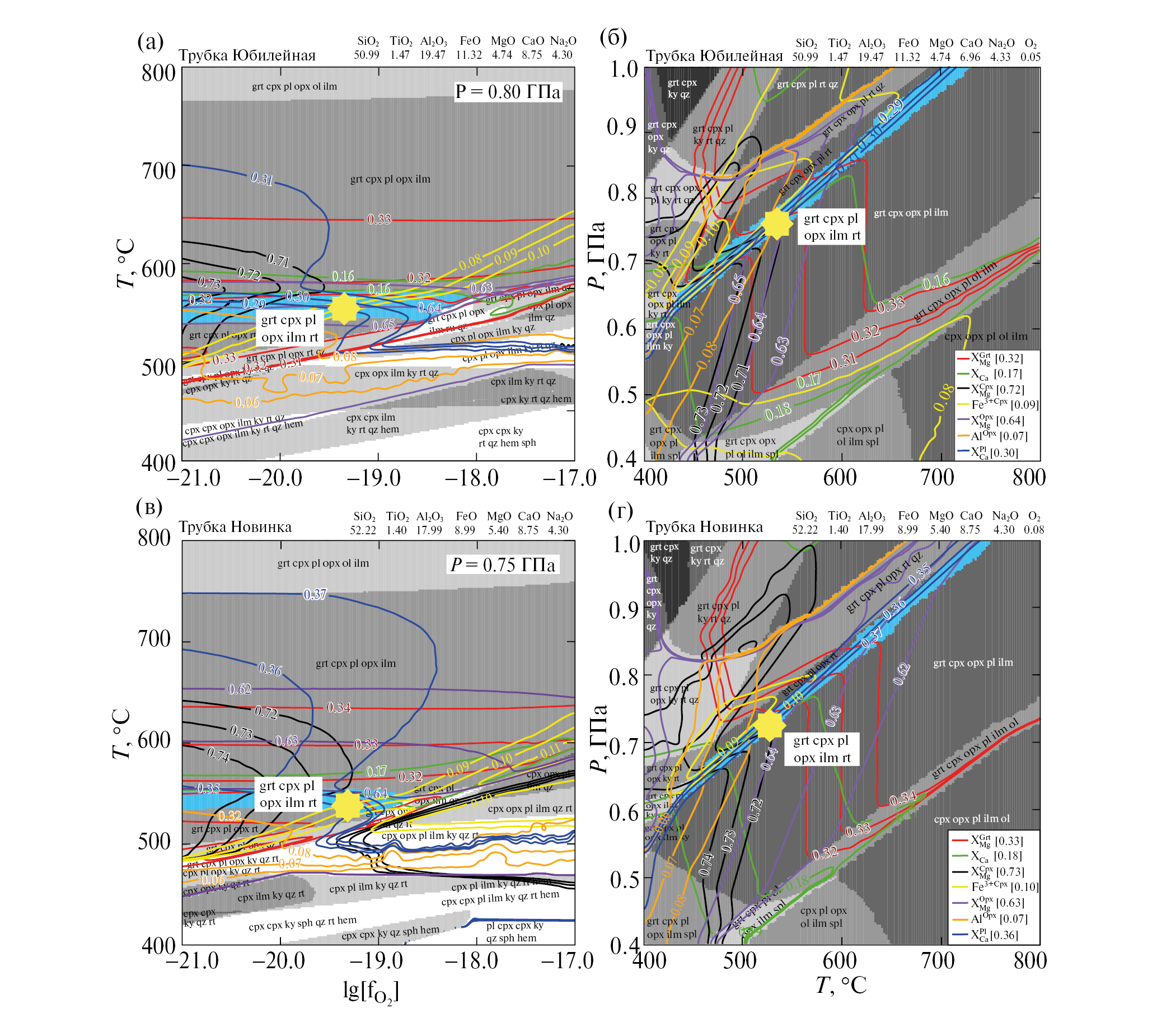 Рис. 3. Фазовые P-T и Т-fO2 диаграммы для гранулитов из трубок Юбилейная (ЮБ‑19-05) и Новинка (Н‑19-44), рассчитанные с помощью Perple_X. а) Т-fO2 диаграммы при 0.8 ГПа для образца ЮБ‑19-05; б) P-T диаграмма для образца ЮБ‑19-05; в) Т-fO2 диаграммы при 0.75 ГПа для образца Н‑19-44; г) P-T диаграмма для образца Н‑19-44. Голубым цветом показано поле парагенезиса породы. Желтой звездой отмечено пересечение изоплет, отвечающих составам минералов породы (указаны в правом нижнем углу PT-диаграмм). Эффективные составы указаны над диаграммами. Изоплеты: XMg Grt = Mg/(Mg+Fetot); XCa Grt = Ca/(Ca+Mg+Fetot); XMg Cpx = Mg/(Mg+Fetot); Fe3+Cpx = Fe3+ (ф. е.); XMg Opx = Mg/(Mg+Fetot); AlOpx = Al (ф. е.); XCa Pl = Ca/(Ca+Na).