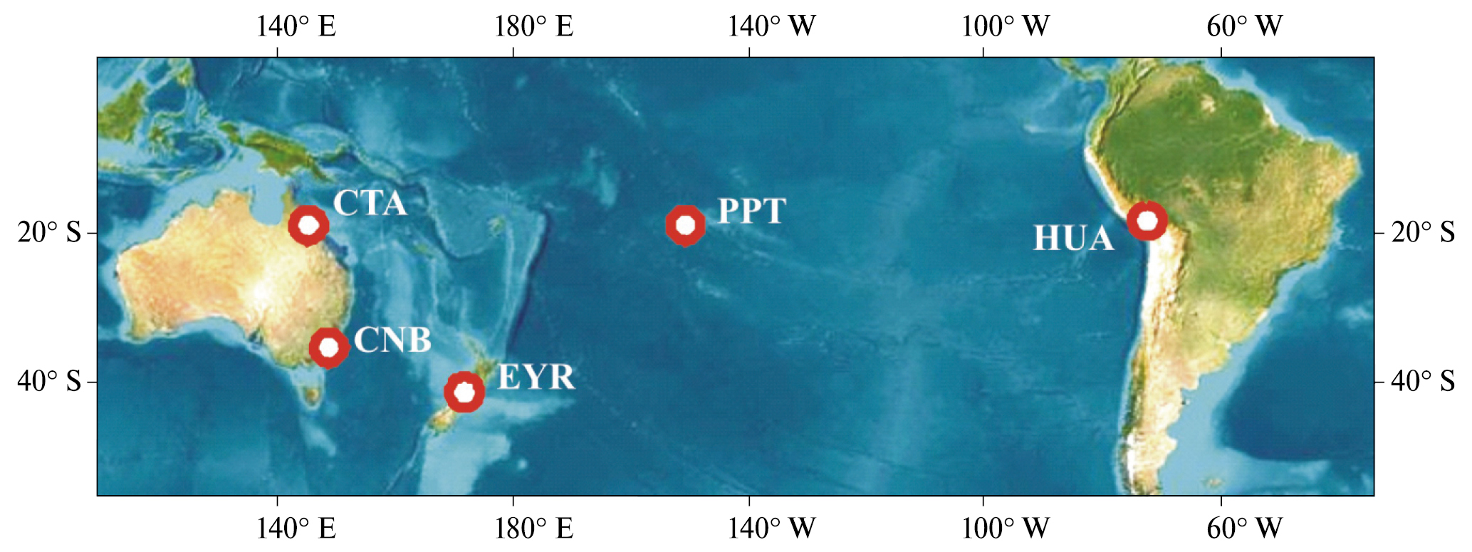 В качестве исходных данных в настоящей работе использовались результаты магнитных измерений, выполненных в обсерваториях сети INTERMAGNET (https://imag-data.bgs.ac.uk/GIN_V1/GINForms), расположенных в южной части Тихого океана (данные о магнитных обсерваториях и их расположение приведены соответственно в табл. 1 и на рис. 1). Привлекались результаты регистрации горизонтальной, наиболее чувствительной к внешним возмущениям, компоненты индукции геомагнитного поля Вх, выполненные в период с 01.01.2013 г. по 31.07.2023 г.