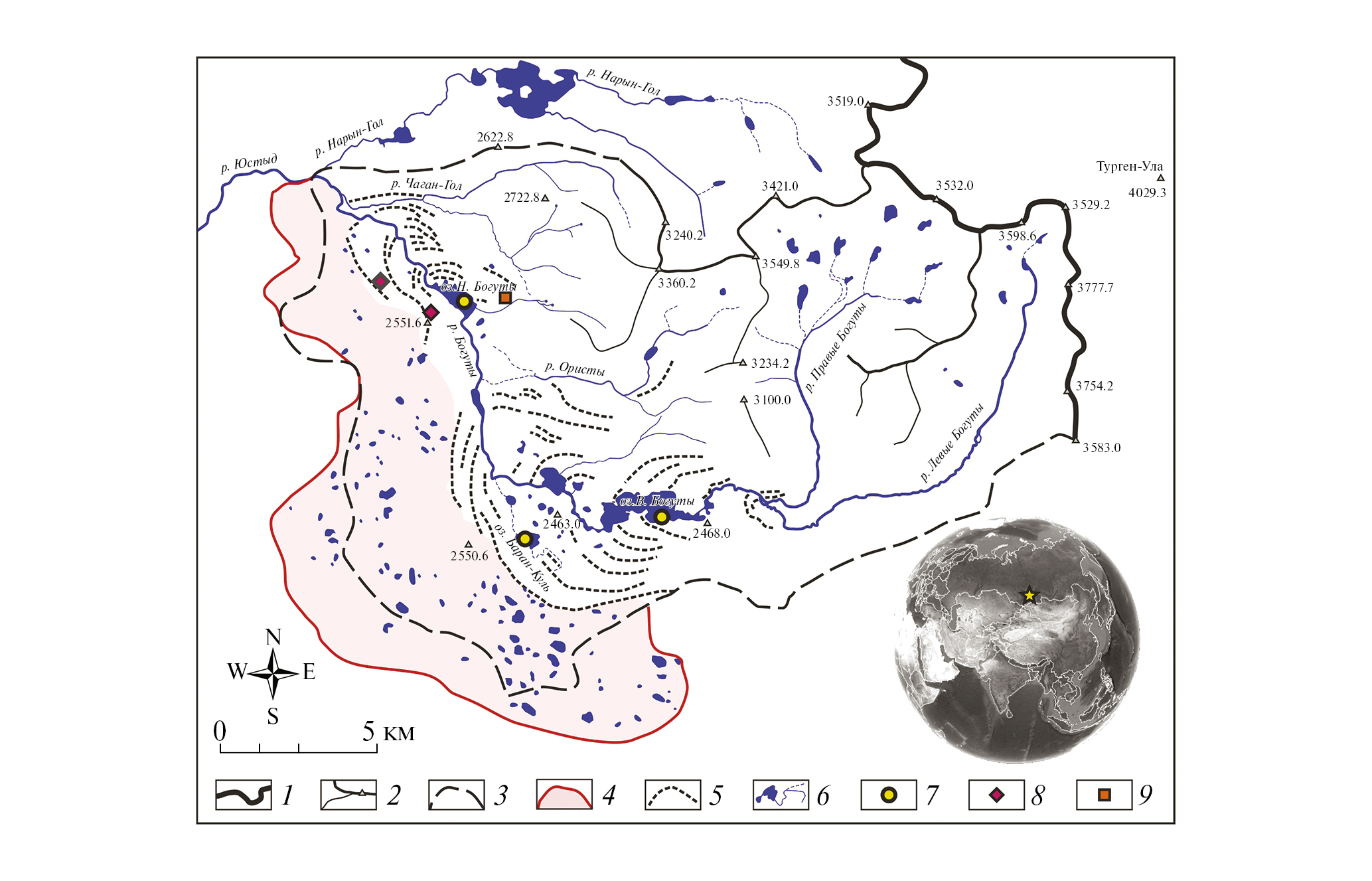Рис. 1. Богутинская высокогорная впадина, ЮВ Алтай, и исследуемые озера. 1 – главный гребень хребта Чихачева; 2 – отроги и отметки высот (м н. у. м.); 3 – граница бассейна р. Богуты; 4 – моренный чехол с бугристо-западинным рельефом; 5 – валы конечно-боковых морен; 6 – гидросеть; 7 – исследуемые озера; 8 – места отбора образцов на 10Ве-датирование [5]; 9 – разрез постледниковых отложений с 14С-возрастом 14 тыс. лет [6–9].