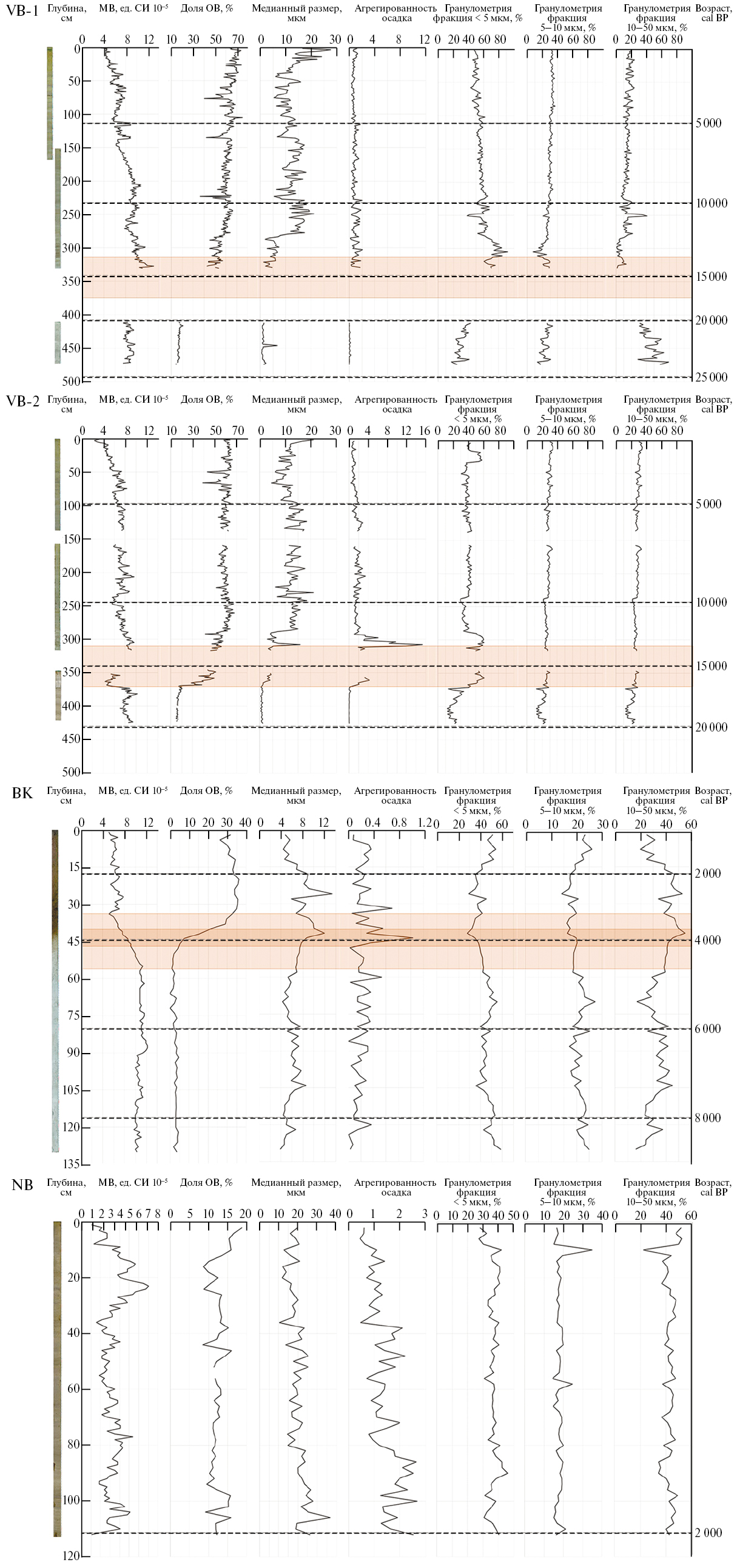 По содержанию ОВ и значениям МВ в керне BK также отчетливо выделяются два интервала с плавным переходом между ними, имеющим большую протяженность относительно переходной зоны, выделенной по литологии (рис. 3). Так, до глубины 0.35 м (~3.5 тыс. л.) содержание ОВ – около 30–35%, а МВ не превышает 6–8·10– 5 ед. СИ. В интервале 0.35–0.55 м (~3.5–4.6 тыс. л.) содержание ОВ начинает падать, а МВ возрастать. С 0.55 м и до основания разреза содержание ОВ менее 4%, а МВ слабо меняется в диапазоне 10–12·10–5 ед. СИ. Отсутствие значимых изменений гранулометрических характеристик показывает, что рост МВ полностью обусловлен прекращением разбавления осадка немагнитной органикой, а не изменением источников сноса.