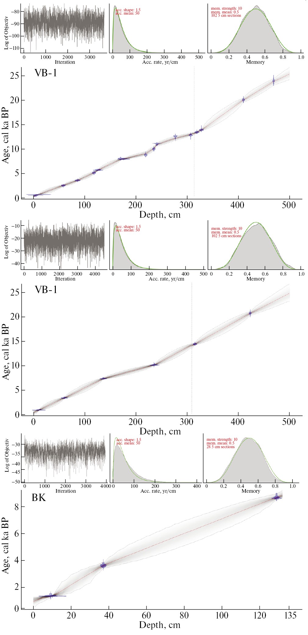Для построения глубинно-возрастных моделей осадконакопления в оз. Верхние Богуты задействованы 17 14С-дат для скв. VB-1 и 7 дат – для VB-2 (рис. 4). Разрез общей мощностью 4.71 м представляет собой осадочную летопись за последние 24 тыс. лет – с максимума последнего оледенения. Тренд постепенного повышения возраста с увеличением глубины в керне позволяет предполагать практически непрерывное осадконакопление за исследуемый период. В обоих кернах средняя рассчитанная скорость осадконакопления оставалась относительно равномерной для всего разреза – 0.20–0.21 мм/год. Согласно моделям, современный ПРЭ в оз. Верхние Богуты составляет ~290 лет. Датирование фрагментов наземной растительности – веточки Salix (1.26 м, VB-1) и семени Larix (2.34 м, VB-2) – и общего ОВ в осадке на этих же глубинах позволило оценить ПРЭ для рубежей ~5.7 и ~9.6 тыс. л. н.: ~1.2 и 1.3 тыс. лет.