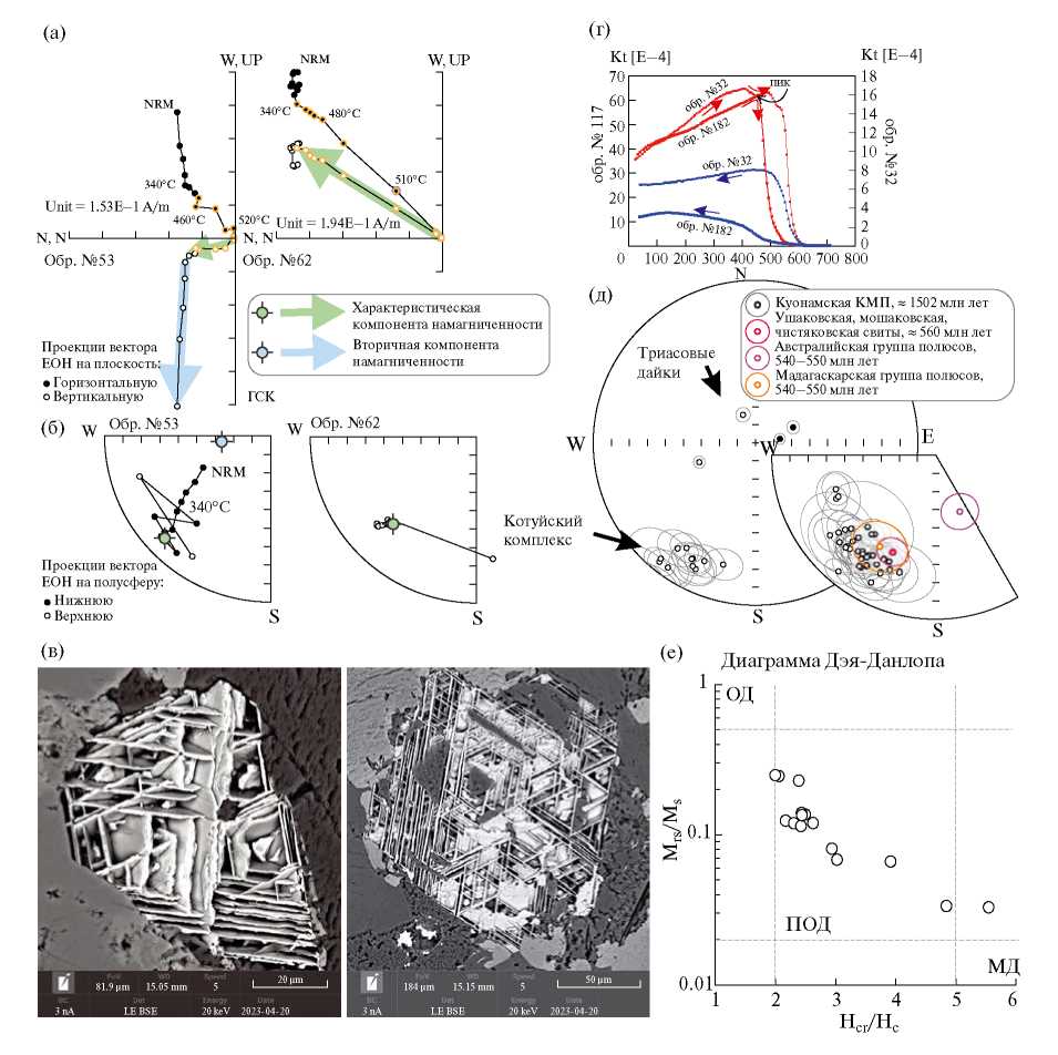 Рис. 2. Результаты петропалеомагнитных исследований интрузивных тел котуйского комплекса. Результаты ступенчатой температурной чистки: а) диаграммы Зийдервельда; б) стереограммы направления вектора ЕОН; в) микрофотографии в сканирующем электронном микроскопе структур высокотемпературного распада кристаллов титаномагнетита; г) график зависимости магнитной восприимчивости от температуры; д) стереограмма направлений намагниченности для тел котуйского комплекса, Куонамской крупной магматической провинции и вендских пород Сибирской платформы [14]; е) диаграмма Дэя-Данлопа.