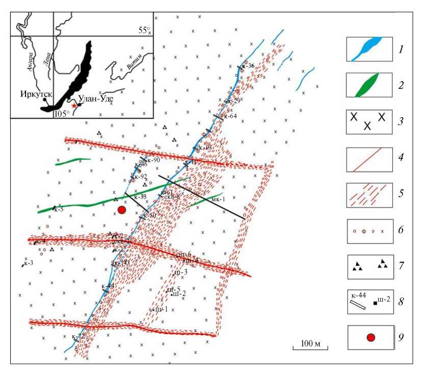 Рис. 1. Геологический план Третьяковского золото-флюоритового месторождения (составлен по материалам Боргойской партии БГУ [16]. 1 – кварц-флюоритовые жильные зоны; 2 – дайки диоритовых порфиритов; 3 – сиениты биотитовые, реже лейкократовые с биотитом, среднезернистые, серо-желтые и зеленовато-серые; 4 – разрывные нарушения; 5 – зоны интенсивного дробления, брекчирования и милонитизации пород; 6 – вторичные изменения: о – окварцевание, ф – флюоритизация, э – эпидотизация, х – хлоритизация; 7 – свалы обломков кварц-флюоритовых руд; 8 – канавы и шурфы, их номера; 9 – место отбора пробы циркон-титаномагнетитовой руды.