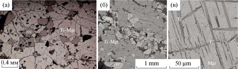 Рис. 3. Общий вид циркон-титаномагнетитового агрегата и структуры распада: а – фото в отраженном свете; б – в обратно-рассеянных электронах; в – увеличенное изображение пластинчатых выделений титановых минералов в магнетите; заметны неоднородности состава, различающиеся по оттенкам в обратно-рассеянных электронах. Ti-Mgt – агрегат Fe–Ti-минералов; zrc – циркон; Mgt – магнетит; Ti – титановые минералы.