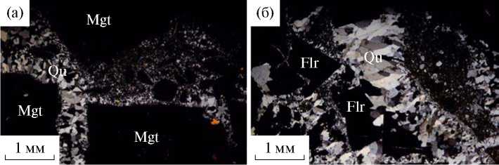 Рис. 4. Фотографии шлифов циркон-титаномагнетитовой (а) и кварц-флюоритовой (б) руд.
