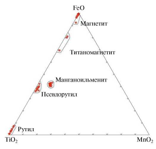 Преобладающими минералами Fe–Ti-агрегата является магнетит, содержащий многочисленные пластинчатые вростки титановых минералов, среди которых нами диагностированы ильменит (манганоильменит), Fe–Ti-оксид, близкий по составу к псевдорутилу (в дальнейшем условно назван псевдорутилом), рутил и магнетит (титаномагнетит) (рис. 5). При больших увеличениях видно, что пластинчатые выделения структуры распада неоднородны и состоят из нескольких вышеперечисленных титановых минералов (рис. 3 в).