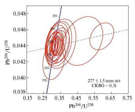 Наличие большого количества зерен циркона позволило провести изотопное U–Pb-датирование. Возраст образца был определен по точке пересечения конкордии и дискордии, построенной по 25 точкам измерения с помощью Excel-макроса Isoplot. Полученное значение изотопного возраста составило 277±1.5 млн лет (рис. 6). Учитывая, что дискордантное положение некоторых точек, вероятно, обусловлено наличием в цирконах нерадиогенного свинца, то также рассчитан (Isoplot) средневзвешенный 206Pb/238U-возраст с 207Pb-коррекцией на обыкновенный свинец, который составил 277±1 со СКВО = 0.4 по 25 измерениям. Хорошая сходимость данных датирования в разных точках анализа свидетельствует об отсутствии возможного влияния факторов, вызывающих искажение результатов, – попадания в кратер фрагментов окружающих минералов, загрязнения поверхности циркона при полировке и т. д.