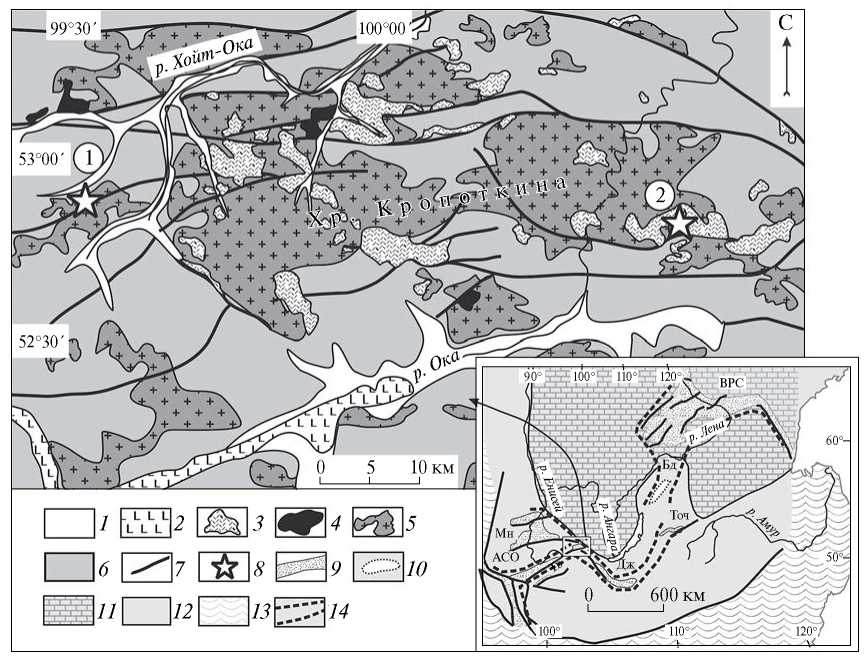Рис. 1. Схема распространения раннедевонских вулканоплутонических ассоциаций в районе хр. Кропоткина по [7]. 1 – рыхлые отложения; 2 – четвертичные базальты; 3–5 – раннедевонские магматические ассоциации: 3 – трахириолит-комендитовые, 4 – базальтовые и бимодальные базальт-трахириолит-комендитовые, 5 – субщелочные и щелочные граниты и сиениты; 6 – додевонские гнейсограниты, габброиды, гранодиориты и плагиограниты; 7 – разломы; 8 – положение Снежного месторождения (1) и Илейского рудопроявления (2); 9–14 – условные к врезке: 9– вулканические впадины и грабены, 10 – область распространения базитовых интрузий в основании Бодайбинского прогиба, 11 – Сибирская платформа, 12 – территория палеоконтинента, 13 – Палеоазиатский океан, 14 – предполагаемые контуры девонской рифтовой системы. ВРС – Вилюйская рифтовая система, АСО – Алтае-Саянская рифтовая область. Грабены и впадины: Мн – Минусинская, Тв – Тувинский, Дж – Джида-Хасуритинский, Точ – Точерский, Бд – Бодайбинский. Прямоугольным контуром выделена территория хр. Кропоткина.