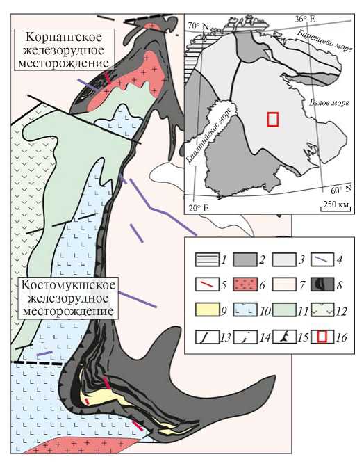 Рис. 1. Схема геологического строения Костомукшского зеленокаменного пояса и его положение в структуре Фенноскандинавского щита (по [8], с изменениями). 1 – каледониды, байкалиды и неопротерозойские образования; 2 – палеопротерозойская кора; 3 – архейская кора; 4 – неопротерозойские (рифейские) лампроиты и кимберлиты; 5 – палеопротерозойские (2.4 млрд лет) долериты; 6 – неоархейские (2.72–2.71 млрд лет) граниты; 7 – неоархейские 2.78 млрд лет гранитоиды ТТГ-ассоциации; 8–2.75 млрд лет метаграувакки с BIF (костомукшская и сурлампинская свиты гимольской серии); 9–2.75 млрд лет силлы и дайки метариолитов (костомукшская свита); 10 – мезоархейские (2.84–2.78 млрд лет) базальты и базальт-коматииты (рувинваарская свита); 11 – мезоархейские туфы, туффиты, риолит-риодациты с простоями BIF и углеродистых сланцев (шурловарская свита); 12 – мезоархейские базальты и коматииты (ниемиярвинская свита); 13–15 – разрывные нарушения: 13 – наблюдаемые, 14 – предполагаемые, 15 – надвиги; 16 – расположение Костомукшского зеленокаменного пояса.