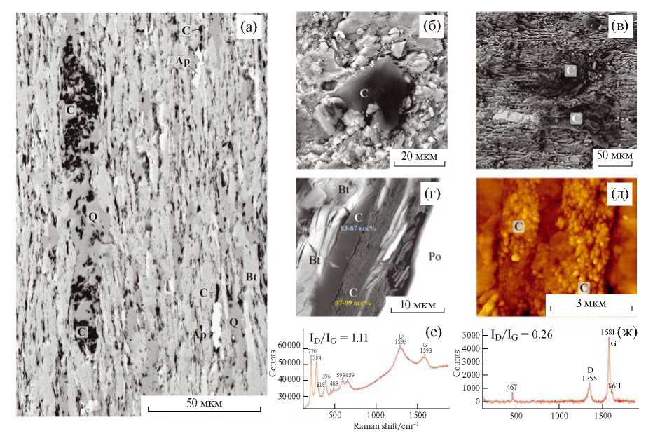 Рис. 2. Углеродсодержащее вещество (УВ) в метапелитах неоархейской полосчатой железорудной формации (BIF) Костомукшcкого зеленокаменного пояса. а – фото аншлифа кварц-биотитового сланца в отраженных электронах (SEM) и положение УВ (черные области) в структуре породы. По данным электронной микроскопии (SEM), углеродистое вещество образует кристаллические формы (б), тонкие пленки (в), массивные и слоистые пакеты (г). По данным атомно-силовой микроскопии массивные пакеты характеризуются более плотной упаковкой наночастиц по сравнению со слоистыми (д). Спектр комбинационного рассеяния (Рамановский спектр) показал присутствие двух типов графита – с плохо упорядоченной структурой (е) и кристаллического (ж). Обозначения минералов: Ap – апатит, C – графит, Bt – биотит, Q – кварц, Po – пирротин.