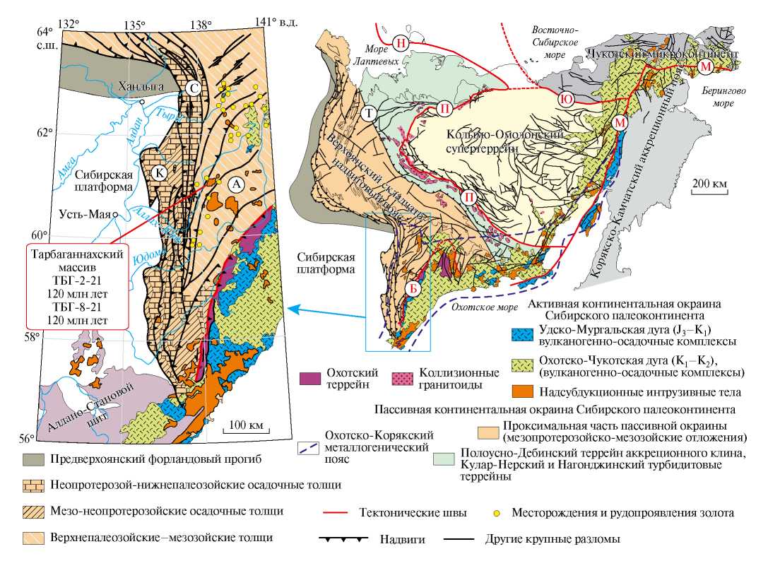 В Аллах-Юньской тектонической зоне (АЮТЗ) Южно-Верхоянского сектора Верхоянского складчато-надвигового пояса (ВСНП) юго-восточной окраины Сибирского кратона размещены большое количество гранитоидных массивов и позднеорогенные золоторудные месторождения и рудопроявления Охотско-Корякского металлогенического пояса (ОКМП) (рис. 1). На геодинамическое и металлогеническое развитие юго-восточной окраины Сибири существенное влияние оказали процессы субдукции, аккреции и коллизии в связи с закрытием Монголо-Охотского океана и Палеопацифики, происходившие от позднего палеозоя до позднего мела [1, 2].