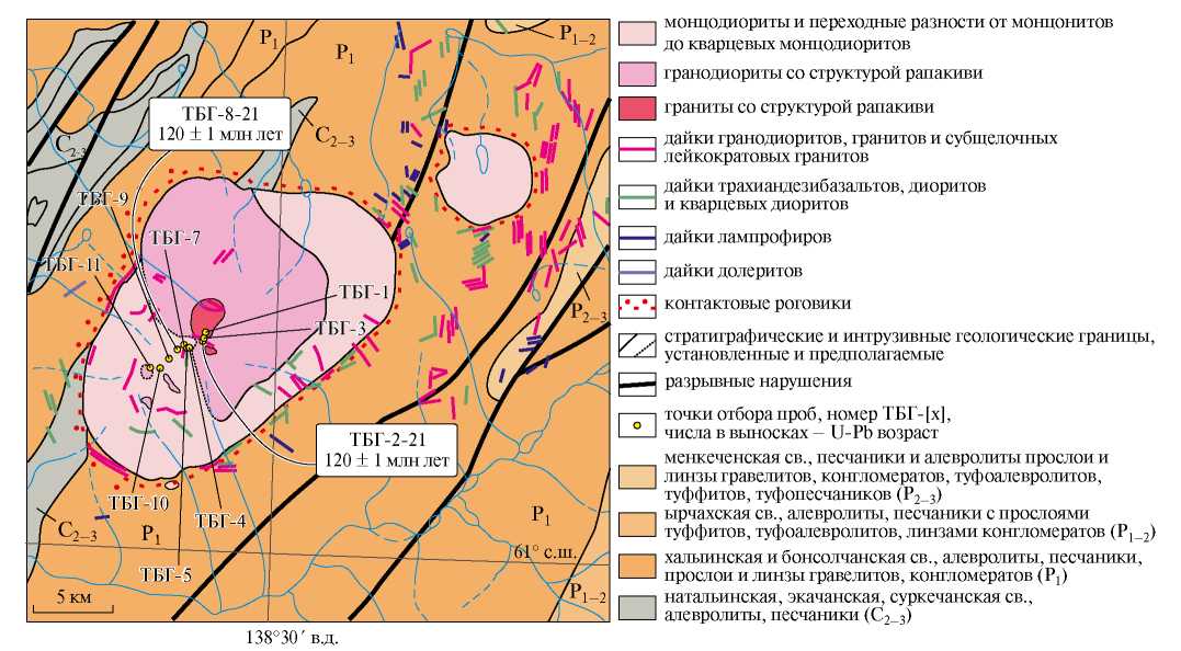 Рис. 2. Схема геологического строения Тарбаганнахского массива, составленная с использованием [8, 11].