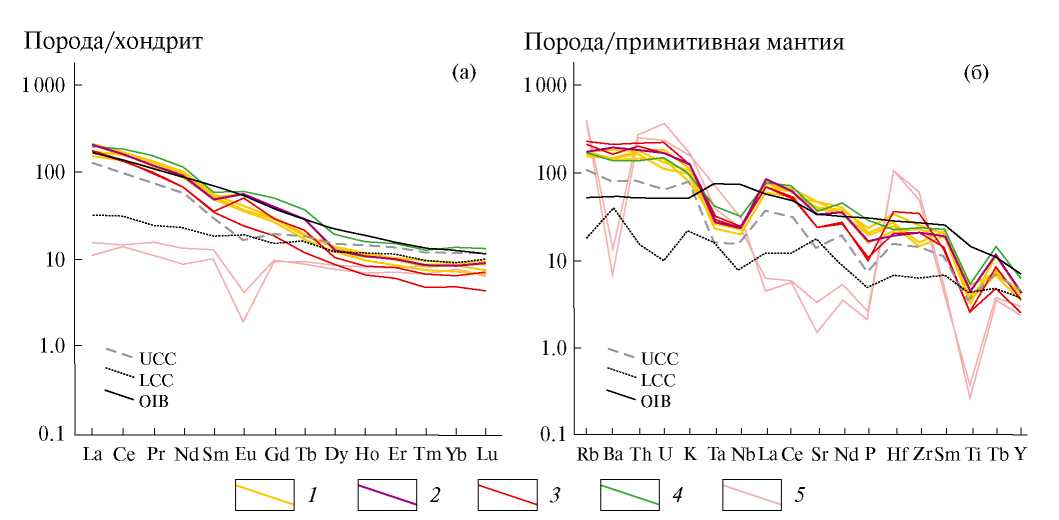 Рис. 3. Спектры распределений редкоземельных элементов (а) и спайдер-диаграммы (б) для пород Тарбаганнахского массива. 1 – монцодиориты и переходные разности от монцонитов до кварцевых монцодиоритов иногда со структурой рапакиви, 2 – гранодиориты со структурой рапакиви, 3 – гранит со структурой рапакиви, 4 – трахиандезибазальты, 5 – субщелочной лейкократовый гранит. Содержания элементов нормированы к хондриту по [16] и к примитивной мантии по [17]. Линии содержания верхней (UCC) и нижней (LCC) континентальной коры приведены по [18]. Линия содержания базальтов океанических островов (OIB) приведена по [19].