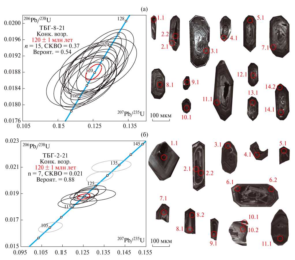 U–Th–Pb-изотопные исследования проведены для 13 зерен циркона и их обломков из пробы ТБГ-8-21 кварцевого монцонита со структурой рапакиви (табл. 1, рис. 4 а). Зерна циркона идиоморфные, полупрозрачные до мутных грязно-желтых и коричневых цветов, с включениями и трещинами. Длина зерен от 190 до 870 мкм; Кудл = 1.6–5.3. На катодолюминесцентных изображениях (CL) зерна циркона обладают ярким свечением, тонкой выраженной зональностью на краях и более грубой зональностью в центре. Конкордантный возраст для 15 аналитических точек составляет 120±1 млн лет (СКВО = 0.37, U = 562–2864 г/т (среднее 1035 г/т), Th = = 284– 4282 г/т (среднее 791 г/т), Th/U = 0.45–1.54 (среднее 0.67)). Высокие содержания урана и тория выявлены в анализах в точках, расположенных на темных (до черных) на CL участках зерен. Аналитическая точка 2.2 имеет наиболее высокие содержания и повышенное значение торий-уранового отношения 1.54. Исключая из содержания урана и тория из точки 2.2: U = 562– 2025 г/т (среднее 904 г/т), Th = = 284– 1285 г/т (среднее 541 г/т), Th/U = = 0.45–0.66 (среднее 0.60). Доля обыкновенного свинца по измеренному 204-му изотопу составила 0.22%.