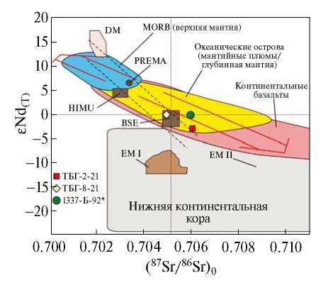 Sm-, Nd-, Rb- и Sr-изотопные исследования были проведены для тех же проб кварцевого монцонита (ТБГ-8-21) и гранодиорита (ТБГ-2-21) со структурой рапакиви из Тарбаганнахского массива, в которых были получены U–Pb- оценки возраста циркона (табл. 2). Поэтому в эту таблицу включена также проба из дайки лампрофира Нежданинского рудного поля по [5], имеющая близкий с ними U–Pb-возраст. Последняя имеет наименьшие значения 147Sm/144Nd (0.09827) и слегка положительные εNd(T) (+0.1), тогда как породы Тарбаганнахского массива имеют немного выше величины147Sm/144Nd (0.09964–0.11976) и слегка отрицательные εNd(T) (–0.1). Как дайки, так и интрузивные породы характеризуются невысокой величиной (87Sr/86Sr)0, варьирующей в узком интервале 0.7054–0.7066. Устанавливаются неопротерозойский и мезопротерозойский Sm–Nd- модельный возраст магматического источника этих пород по одно- и двустадийной моделям, для кварцевого монцонита (ТБГ-8-21) и лампрофира (1337-Б-92) – 0.8–0.9 млрд лет и гранодиорита (ТБГ-2-21) – 1.2 млрд лет. Последнее свидетельствует о вкладе континентального корового материала в магматическом источнике этих пород. На диаграмме εNd(T) – (87Sr/86Sr)0 по [20] все три пробы находятся в области изотопных составов обогащенных мантийных источников, при этом проба кварцевого монцонита (ТБГ-8-21) находится в поле резервуара валовая силикатная Земля (BSE), а проба гранодиорита (ТБГ-2-21) соответствует, вероятно, обогащенному мантийному источнику (EM II), смешанному с нижнекоровым компонентом.