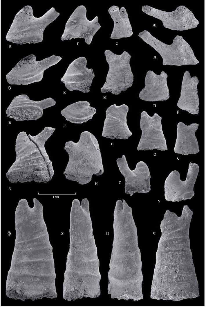 Рис. 1. Виды рода Yochelcionella Runnegar et Pojeta, 1974 из нижнего кембрия Западной Монголии: а–и – Y. chinensis Pei, 1985: а–в – экз. ПИН, № 3302/1709, внутреннее ядро (хаирханская свита, разрез Шингэин-Нуруу): а – вид слева, б – косой вид слева, в – косой вид с устья; г – экз. ПИН, № 3302/1940, внутреннее ядро, вид слева; д–ж – экз. ПИН, № 3302/1705, внутреннее ядро (саланыгольская свита, разрез Салааны-гол): д – вид справа, е – косой вид сзади, ж – косой вид сверху; з – экз. ПИН, № 3302/1606, внутреннее ядро, вид слева (хаирханская свита, разрез Шингэин-Нуруу); и – экз. ПИН, № 3302/1881, внутреннее ядро, вид справа (хаирханская свита, разрез Шингэин-Нуруу); к, л – Yochelcionella sp., экз. ПИН, № 3302/1819 (хаирханская свита, разрез Шингэин-Нуруу): к – вид слева, л – косой вид сверху; м–с – Y. parva Zhegallo, 1996 (хаирханская свита, разрез Шингэин-Нуруу): м – паратип ПИН, № 3302/1610, внутреннее ядро, вид слева; н – экз. ПИН, № 3302/1806, внутреннее ядро, вид справа; о–р – голотип ПИН, № 3302/1609, внутреннее ядро: о – вид слева, п – косой вид сверху, р – косой вид с сзади; с – экз. ПИН, № 3302/1870, внутреннее ядро, вид слева; т–ч – Y. crassa Zhegallo, 1996 (хаирханская свита, разрез Шингэин-Нуруу): т – экз. ПИН, № 3302/1934, внутреннее ядро, вид справа; у – экз. ПИН, № 3302/1931, внутреннее ядро, вид слева; ф–ц – паратип ПИН, № 3302/1605, внутреннее ядро: ф – вид слева, х – косой вид спереди, ц – косой вид с сзади; ч – экз. ПИН, № 3302/1706, внутреннее ядро, вид слева.