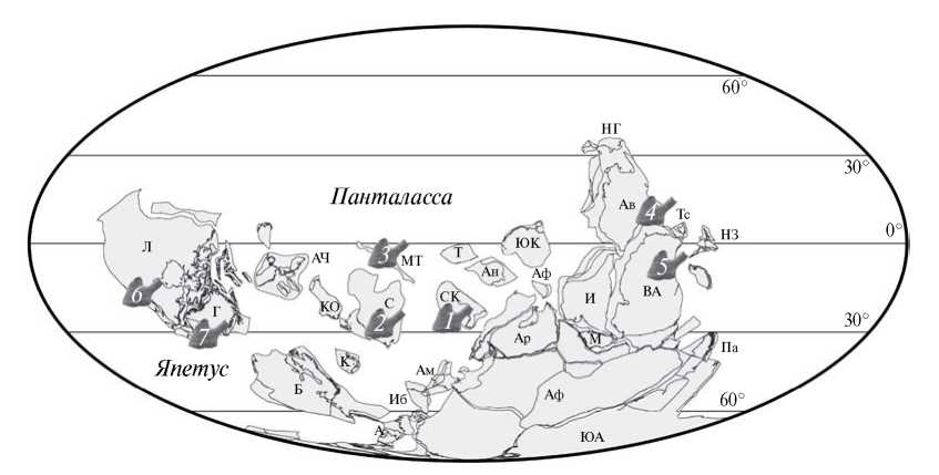 Рис. 2. Палеогеографическое распространение вида Yochelcionella chinensis Pei, 1985 в ботомское время раннего кембрия; обозначения: 1 – Северный Китай (провинции Хенань и Шэньси), 2 – Сибирская платформа (Восточное Прианабарье), 3 – Западная Монголия (Дзабханская зона), 4 – Южная Австралия (хр. Флиндерс), 5 – Восточная Антарктида (Горы Черчилля), 6 – США (штат Пенсильвания), 7 – Канада (Западный Ньюфаундленд); обозначения основных континентов и крупных террейнов: А – Авалония, АЧ – Арктическая Аляска и Чукотка, Ав – Австралия, Ам – Армориканские террейны, Ан – Аннамия, Ар – Аравия, Аф – Африка, Б – Балтийская платформа, ВА – Восточная Антарктика, Г – Гренландия, И – Индостан, Иб – Иберийский массив, К – Карский микроконтинент, КО – Колымо-Омолонский микроконтинент, Л – Лаврентия, М–Мадагаскар, МТ – Монгольские террейны, НГ – Новая Гвинея, НЗ – Новая Зеландия, Па – Патагония, С–Сибирская платформа, СК – Северо-Китайская платформа, Т – Таримский блок, Тс – Тасмания, ЮА – Южная Америка, ЮК – Южно-Китайская платформа.