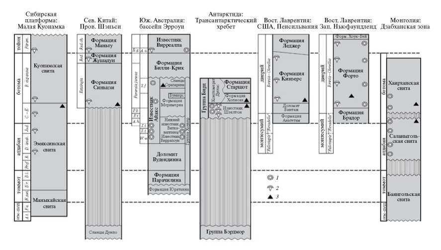 Рис. 3. Стратиграфическое распространение вида Yochelcionella chinensis Pei, 1985 в нижнем кембрии Сибирской платформы [14], Северного Китая [10, 16], Южной Австралии [11], Антарктиды [19, 20], Восточной Лаврентии [12, 13, 17] и Западной Монголии (наши данные); обозначения: 1 – зональные комплексы археоциат, 2 – зональные комплексы трилобитов, 3 – находки Yochelcionella chinensis; сокращения зон: A. a. – Archaeocyathus abacus; A. h. – Abadiella huoi; A. t. – Anabarites trisulcatus; B. expansus – Bergeroniellus expansus; C.-E. – Calodiscus–Erbiella; D. anab. – Delgadella anabara; D. l. – Dokodocyathus lenaicus; D. r. – Dokidocyathus regularis; Jud. – Judomia; J. t. – Jugalicyathus tardus; N. sun. – Nochoroicyathus sunnaginicus; P. a. – Purella antiqua; Par. b. – Pararaia bunyerooensis; Par. t. – Pararaia tatei; Prof. – Profallotaspis jakutensis; Red. – Redlichia; Red. ch. – Redlichia chinensis; R. g. – Redlichia guizhouensis; S. f. – Syringocnema favus; S. t. – Spirillicyathus tenuis; W. w. – Warriootacyathus wilkawillinensis.