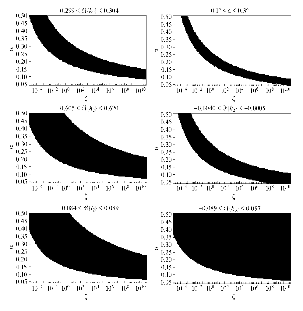Рассмотрим теперь общий случай, когда варьируются одновременно оба параметра. Для этого рассчитаны числа Лява для 32200 пробных моделей Земли – двух вариантов распределения вязкости и 16100 комбинаций параметров α и ζ. На рис. 1 выделяются черными пикселями области, в которых для моделей РВВ выполняется по отдельности каждое из шести используемых условий.