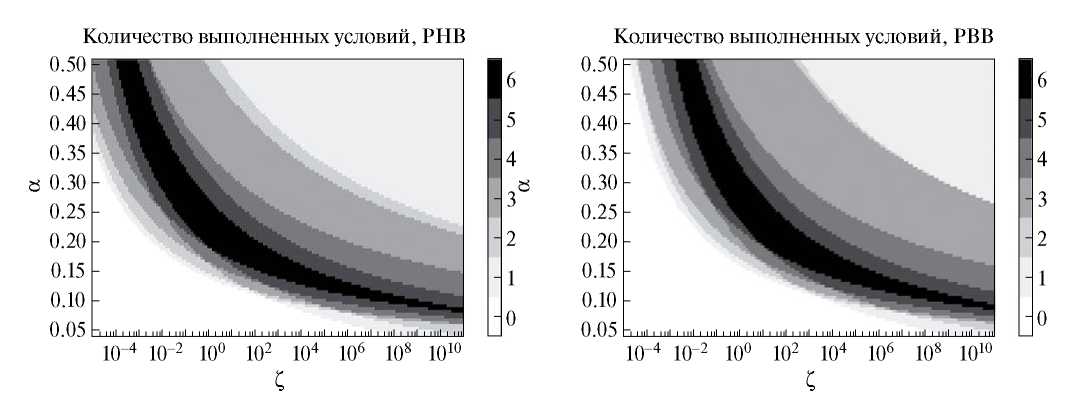 Рис. 2. Количество выполненных условий в зависимости от α и ζ для различных распределений вязкости η: модель РНВ (слева), модель РВВ (справа). Черными пикселями показаны области и , в которых все шесть условий из табл. 2 выполняются одновременно.
